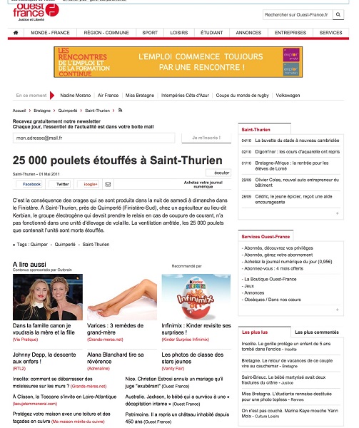 Le 1er mai 2011 suite à des orages dans le Finistère une coupure d’électricité n’est pas relayée par le groupe électrogène prévu en cas de panne. 25 000 poules meurent étouffées.