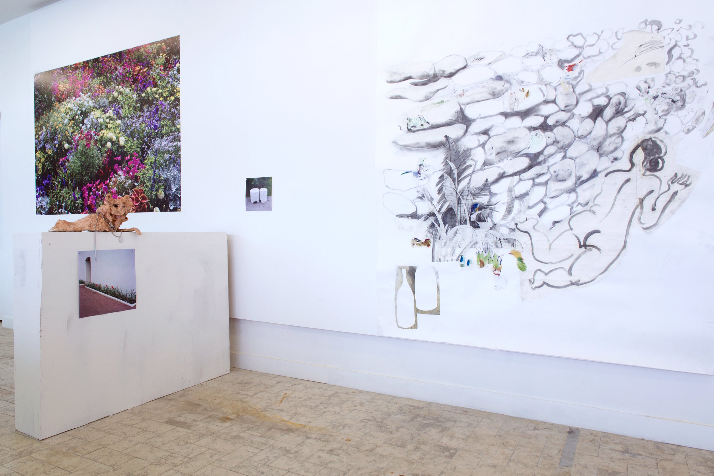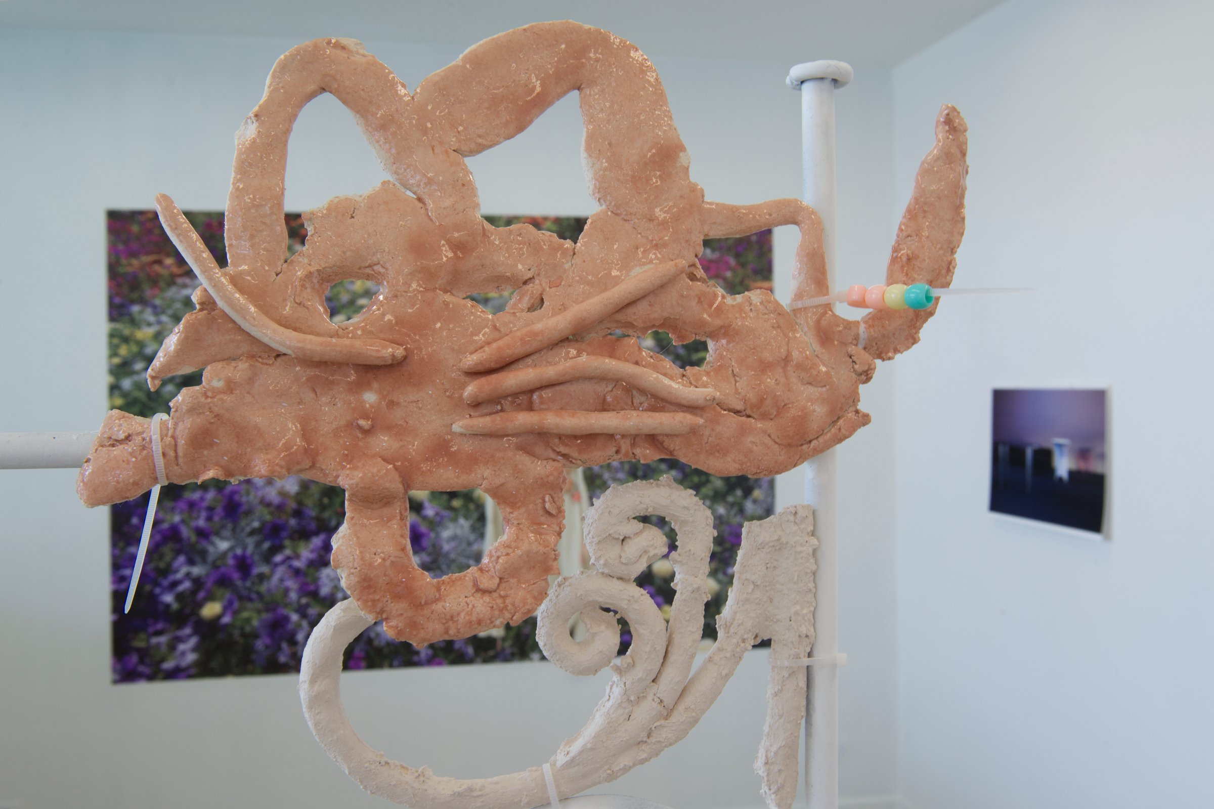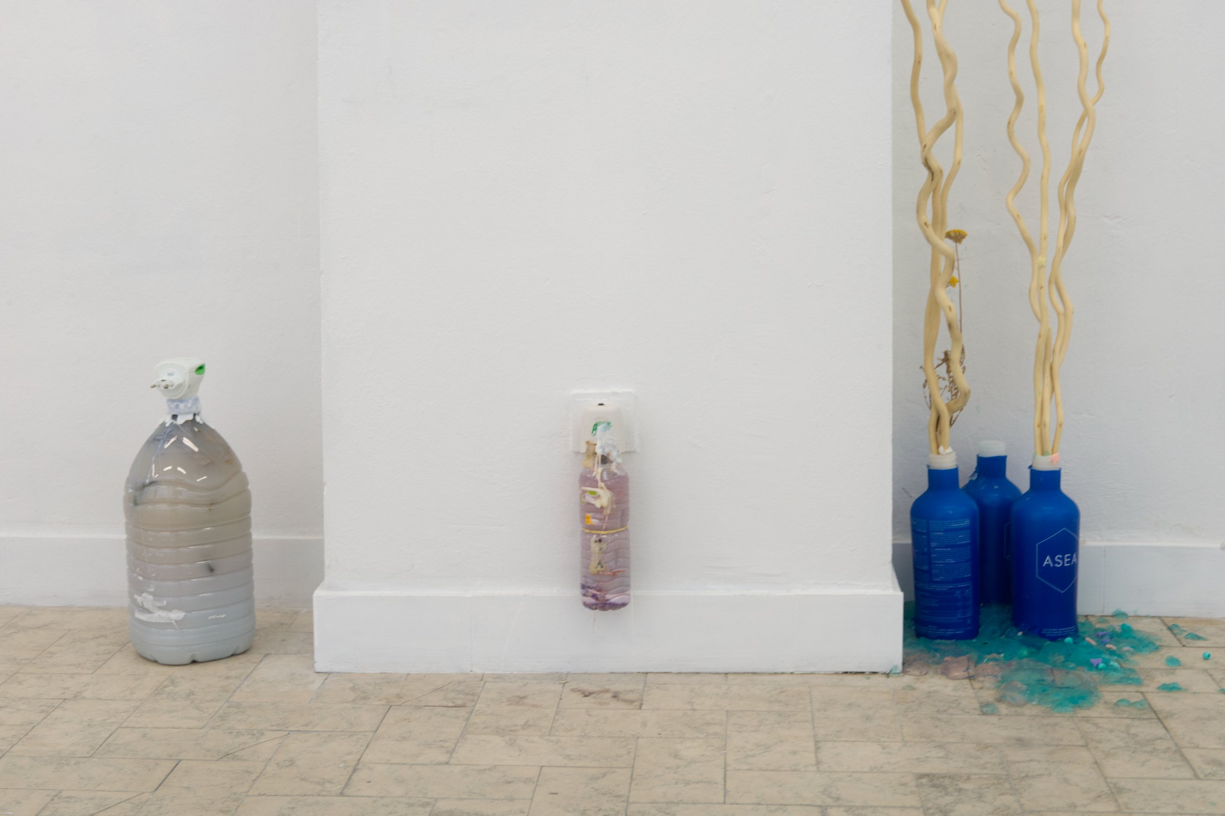 Installation : dessins, céramique, 65 kg d’agar-agar, photographies, plastique, chaises, jeans, post-it, posters, poème, glutane, dimensions variables