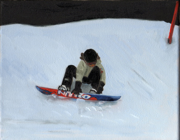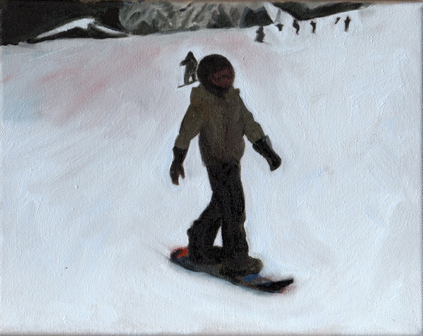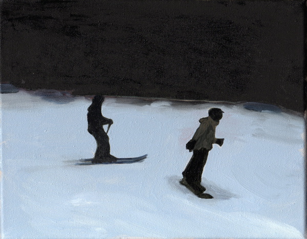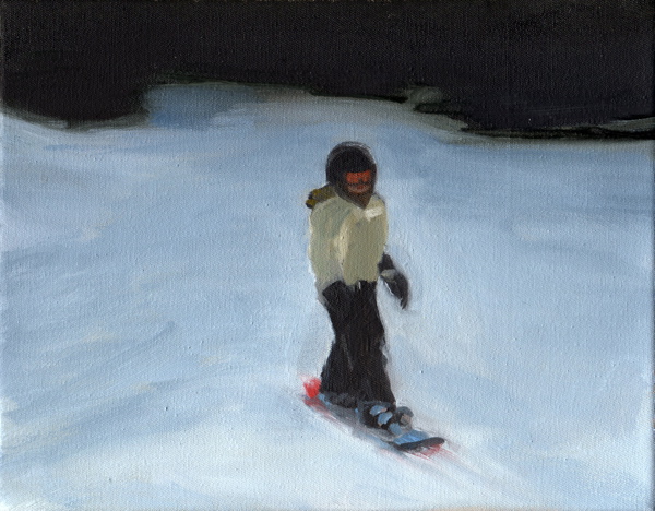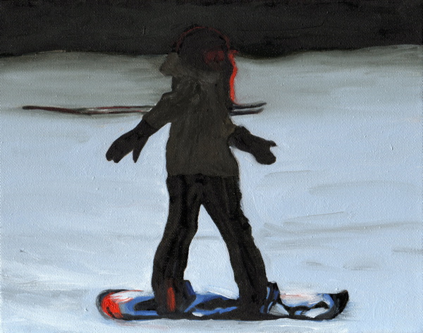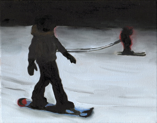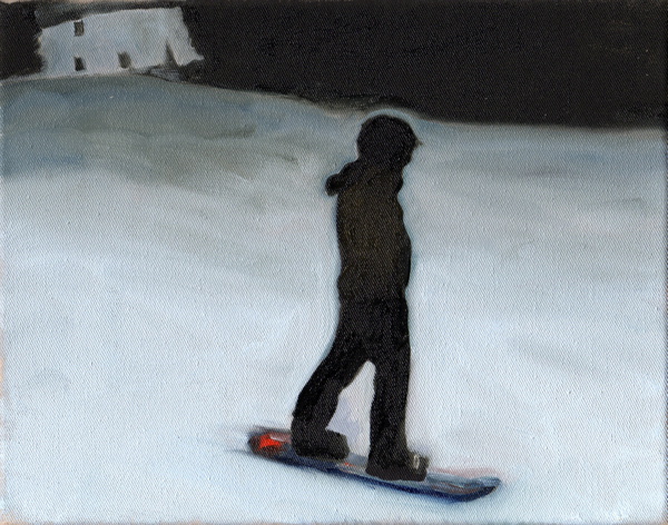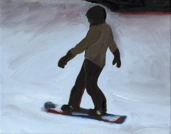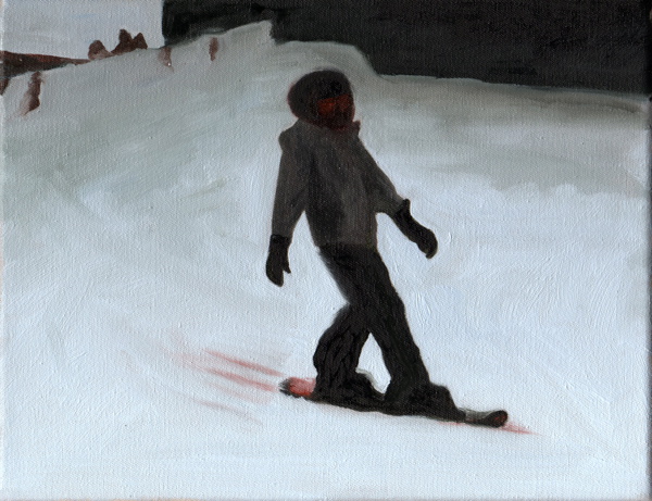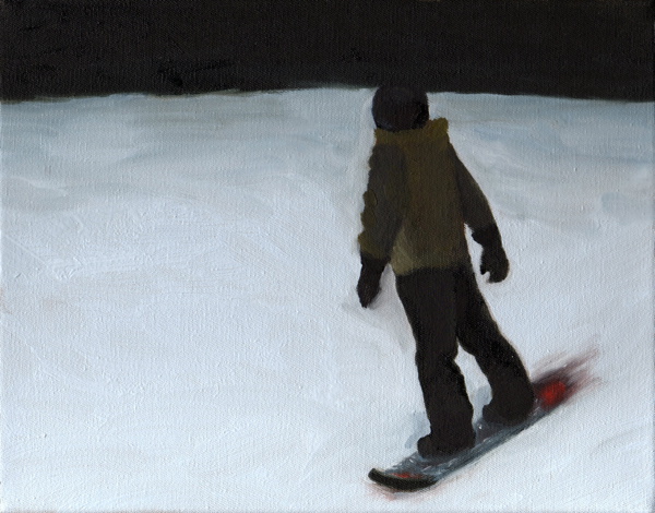 « A partir d’images prises avec un téléphone portable sur une piste de ski en Suisse, après les avoir réceptionnées sur mon ordinateur, j’ai photographié l’écran pour récupérer quelques instantanés de cette descente en snowboard. Les tableaux de cette série traduisent en peinture cette perte de luminosité. »