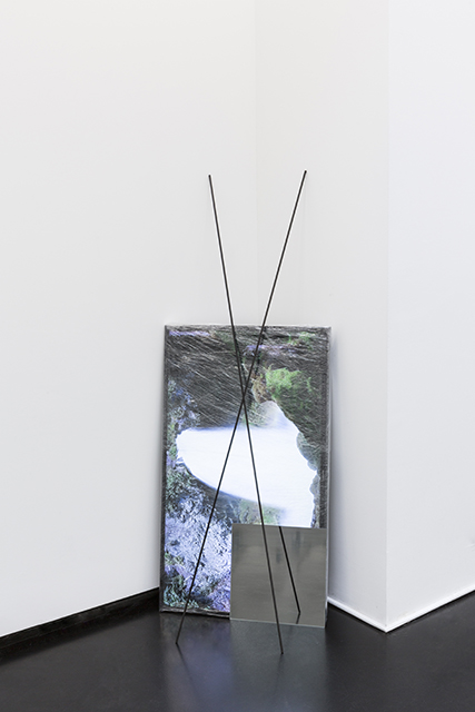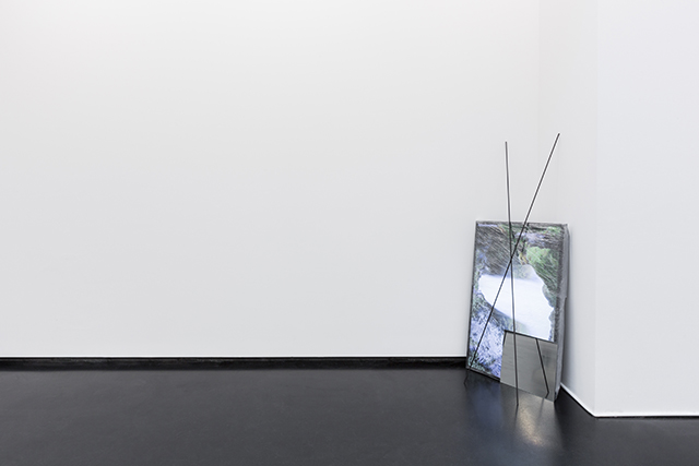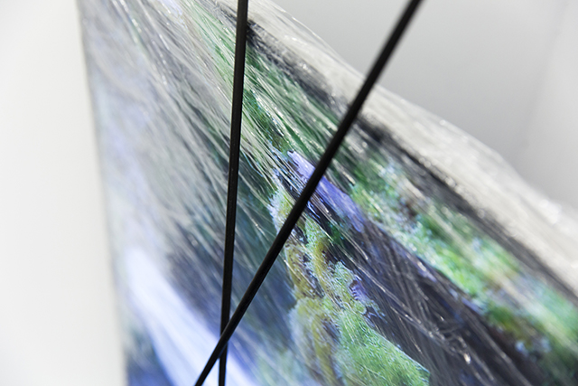Écran plat, film d’emballage, boucle vidéo 32’14, fibre de carbone, miroir, 50 x 54 x 144 cm