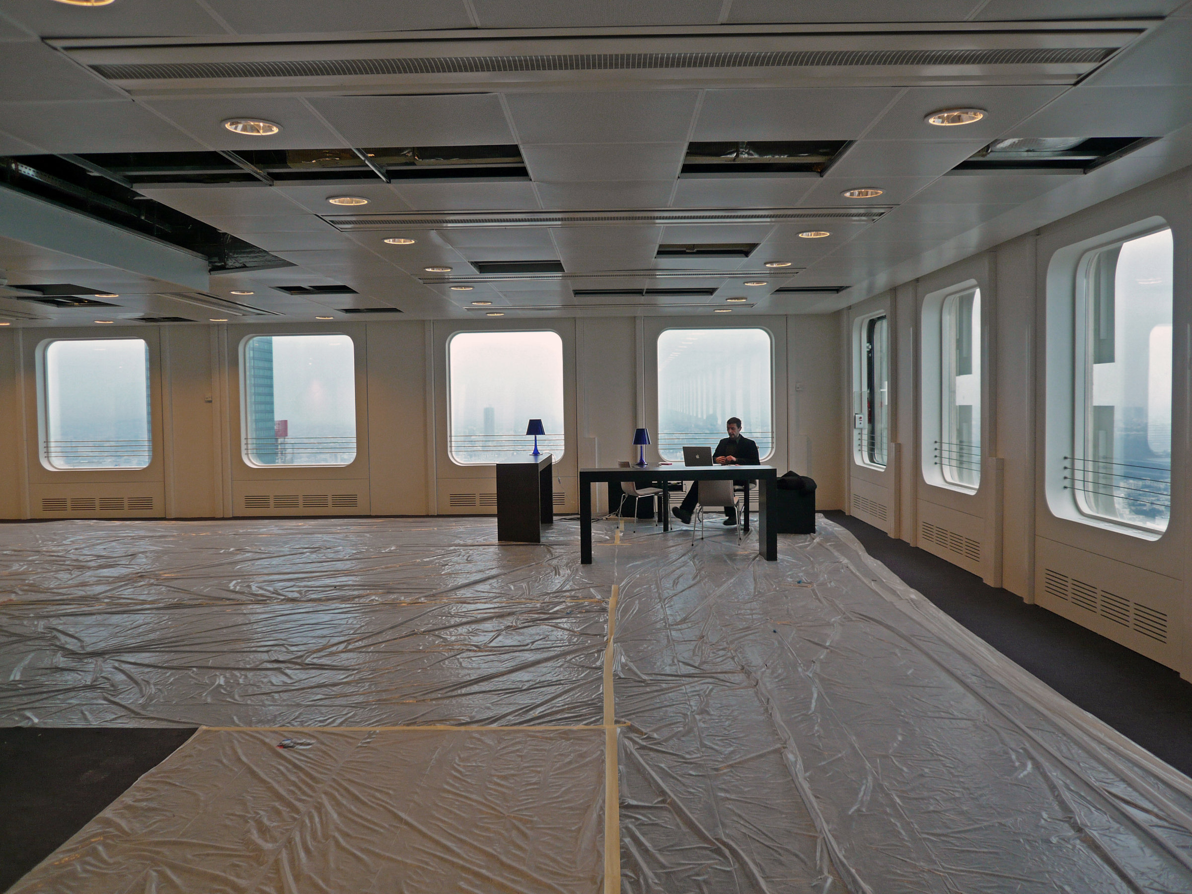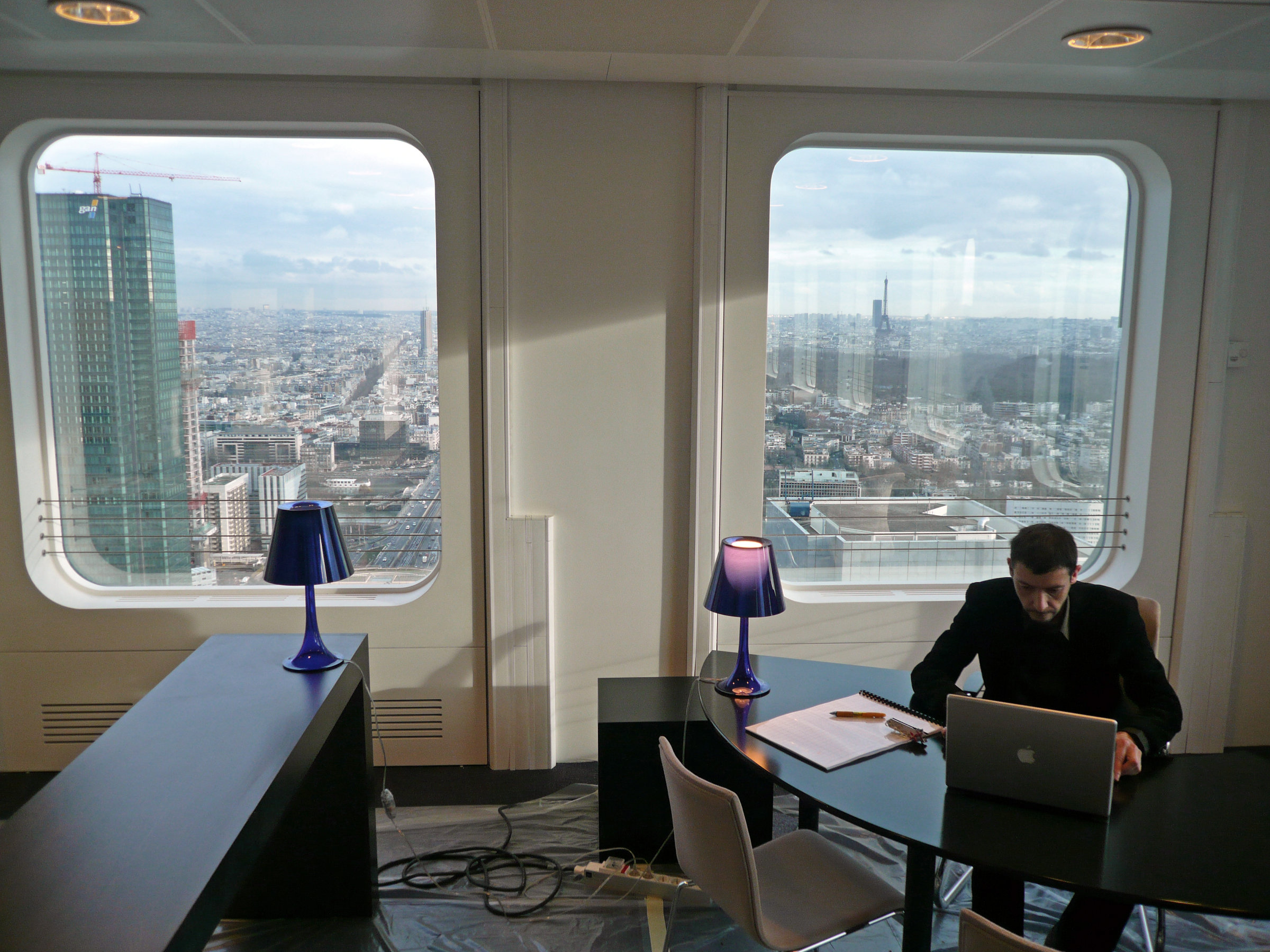 Pendant deux semaines, [Laurent Tixador] a ainsi soigneusement reproduit les gestes de nombreux travailleurs du secteur tertiaire. Chaque jour, il a enfilé son costume, emprunté la ligne 1 du métro, circulé dans les sous-sols de l’Esplanade, justifié son identité à l’entrée de la Tour Ariane, le centre de son exploration. Il y a installé son bureau au quarante-deuxième étage dans un espace immense, entouré de baies vitrées depuis lesquelles on peut parcourir du regard Paris et ses environs dans un rayon de quinze kilomètres, la distance la plus propice à la découverte selon Thoreau.