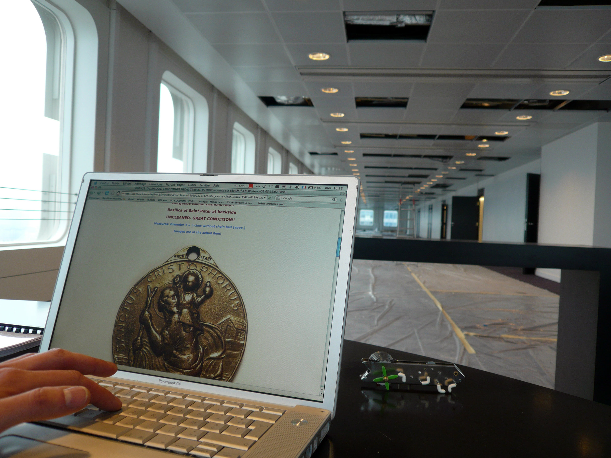 Cette question de la singularité, Laurent l’aborde assez subtilement. Avec quelques gadgets sur son bureau, mais surtout par le travail qu’il a engagé à l’abri des regards de ses collègues : collecter via le site Ebay des médailles de Saint-Christophe, le saint patron des voyageurs, qu’il fait importer le temps de l’exposition à La Box. Jour après jour, il agrémente sa collection de nouvelles pièces et la compose comme d’autres constituent une armée de petits soldats. Sur place, les responsables de la galerie, en respectant les recommandations précises de Laurent, accrochent sur le mur les porte-bonheur qui forment, à mesure des arrivages, des petits bataillons organisés autour d’une ligne de front.