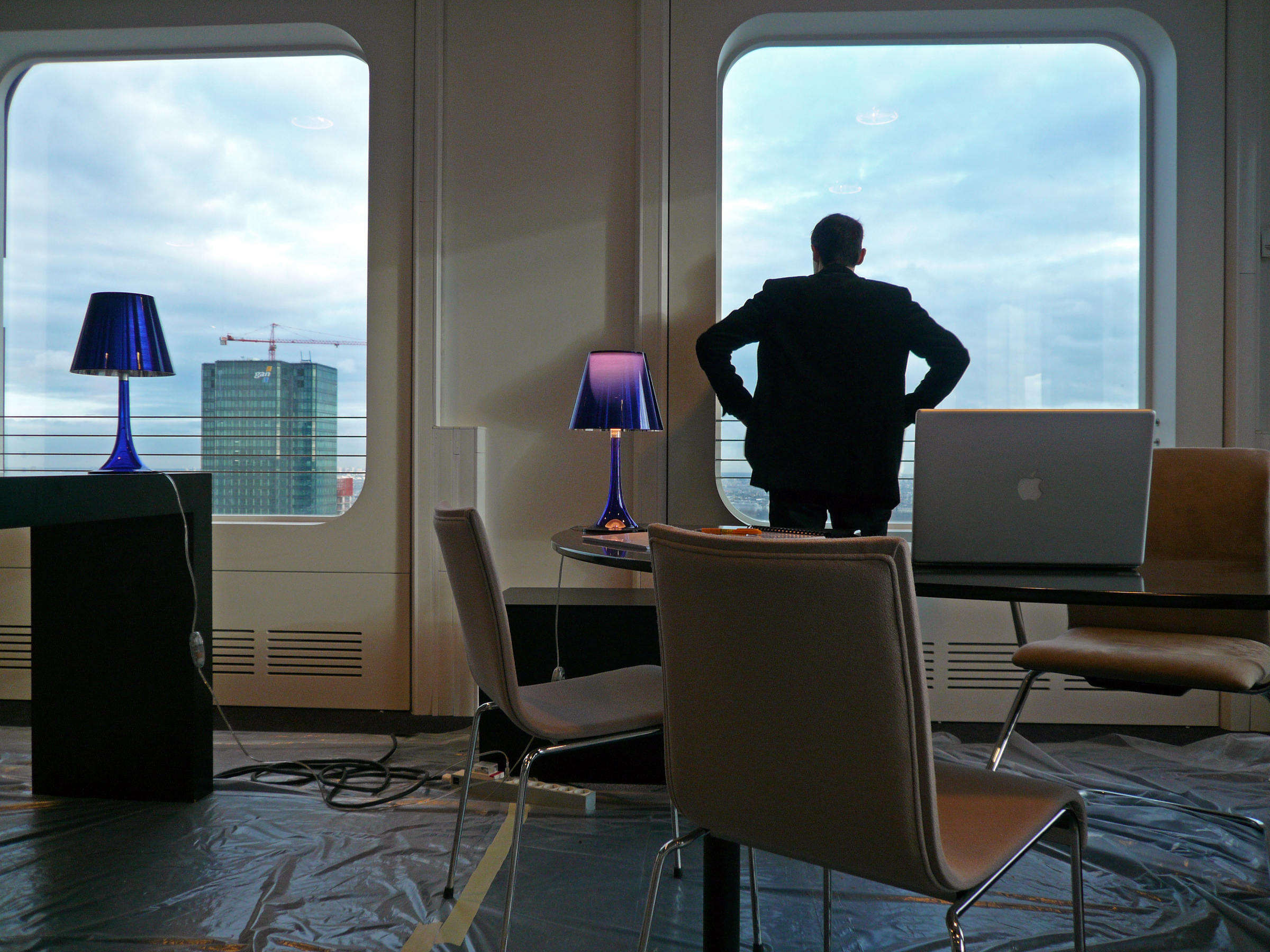 Dans ce décor de cinéma, Laurent a tenté de « capter » une certaine manière d’être - aussi bien fantasmée que réelle - des jeunes cadres dynamiques qu’il a croisés dans les couloirs. Elle s’est traduite par une façon un peu raide de porter son sac, un regard à la fois proche et lointain adressé aux réceptionnistes, une manière de se tenir face à son ordinateur - autant de gestes qui doivent signifier, dans cet univers ultra-codifié, une certaine assurance.Ce langage de signes, Houellebecq le traduit particulièrement bien dans son premier roman. J’en ai sélectionné un court extrait : « Pour ma part, c’est toujours avec une certaine appréhension que j’envisage le premier contact avec un nouveau client ; il y a différents êtres humains, organisés dans une structure donnée, à la fréquentation desquels il va falloir s’habituer ; pénible perspective. Bien entendu l’expérience m’a rapidement appris que je ne suis appelé qu’à rencontrer des gens sinon exactement identiques, du moins tout à fait similaires dans leurs coutumes, leurs opinions, leurs goûts, leur manière générale d’aborder la vie. Il n’y a donc théoriquement rien à craindre, d’autant que le caractère professionnel de la rencontre garantit en principe son innocuité. Il n’empêche, j’ai également eu l’occasion de me rendre compte que les êtres humains ont souvent à cœur de se singulariser par de subtiles et déplaisantes variations, défectuosités, traits de caractère et ainsi de suite — sans doute dans le but d’obliger leurs interlocuteurs à les traiter comme des individus à part entière. {note}1 »