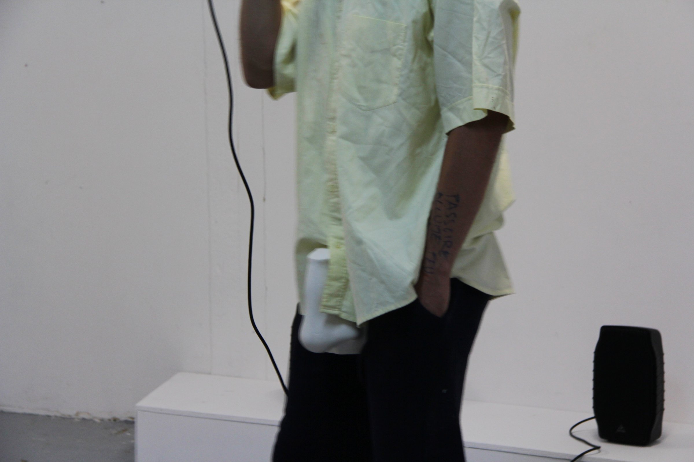A l’intérieur de la galerie, portant une reproduction en plâtre du nez de David de Michel-Ange, je chante une chanson de Daniel Johnston et demande au public, comme il l’a fait en 1990, de reprendre avec moi l’unique phrase de Funeral Home : « Maison funéraire, maison funéraire, je vais à la Maison funéraire, j’ai acheté un cercueil brillant et noir, je vais aux funérailles et je ne reviendrai jamais. »