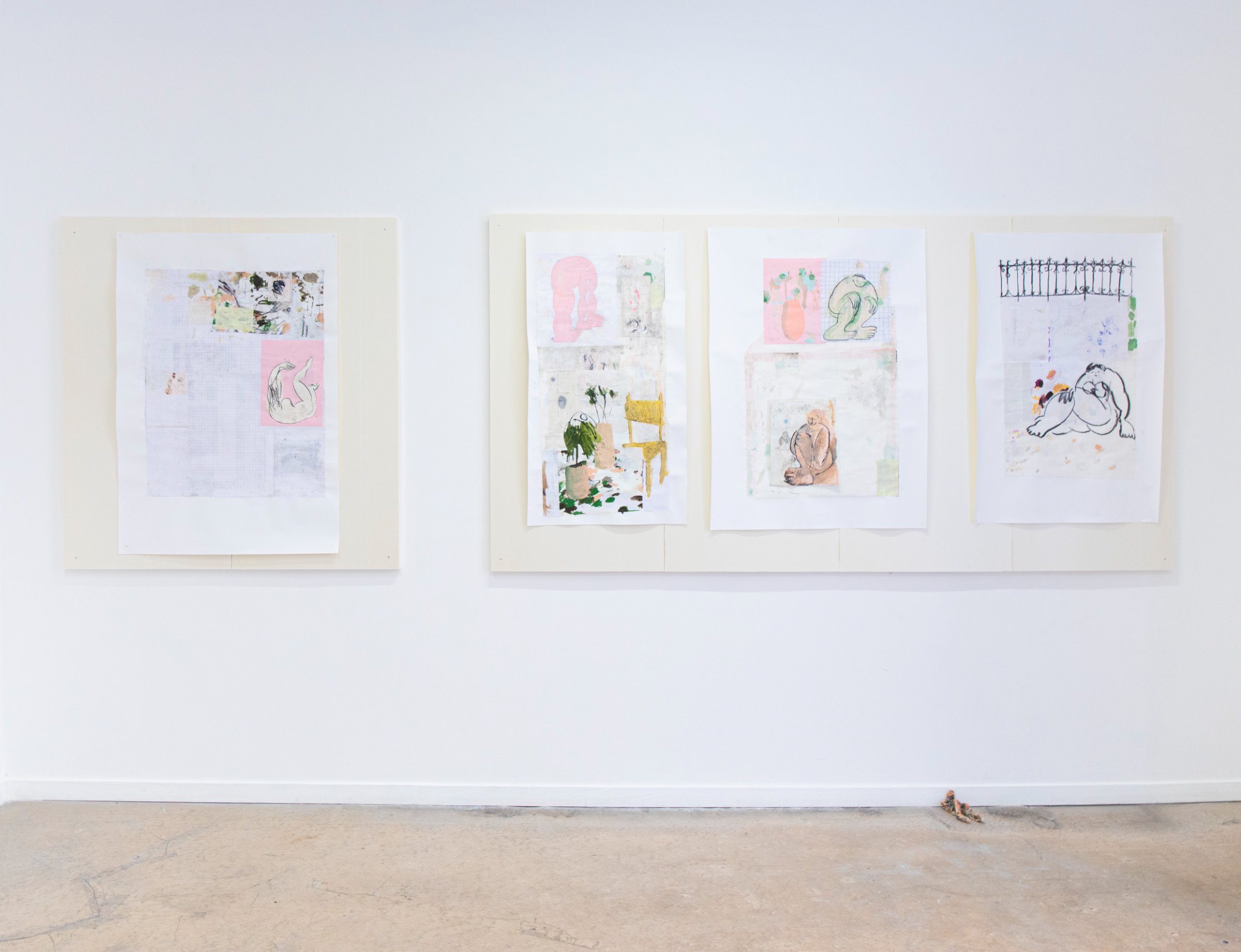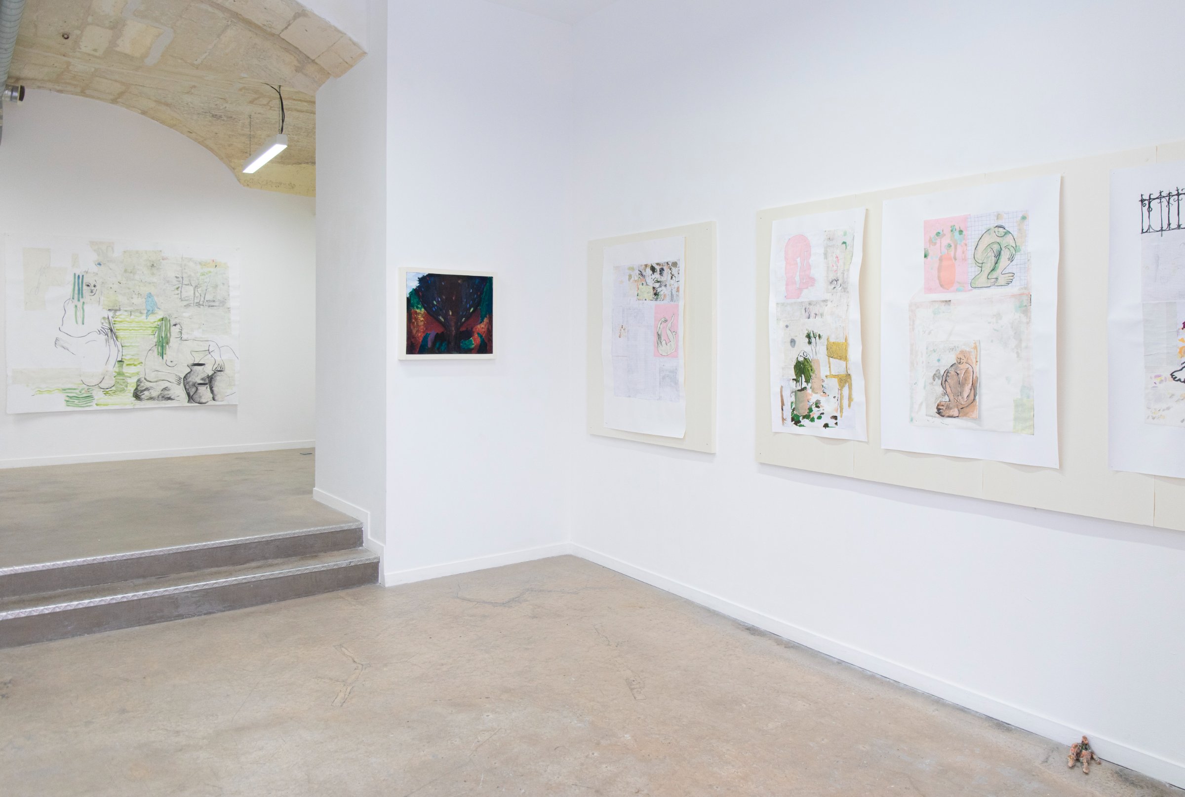 Des peintures et des dessins, certes, mais ici ces techniques classiques sont imprégnées de culture fluxus, d’arts performatifs et conceptuels, de rythmes de Hard Music et d’un esprit « pourquoi pas ». On y trouve des peintures en mousse expansée et des papiers simplement accrochés sur (les mêmes) panneaux en mousse : c’est l’école buissonnière, le jardin comme terrain de jeu.