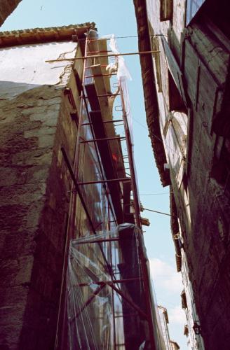 Invité à intervenir dans rue du Port de Graule à Périgueux en 1977, Jean Sabrier y déploie plusieurs éléments de chantier qu’il peint en trompe-l’œil.