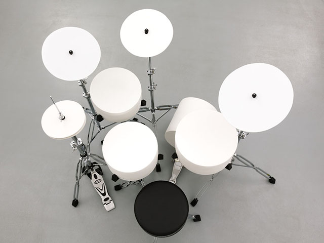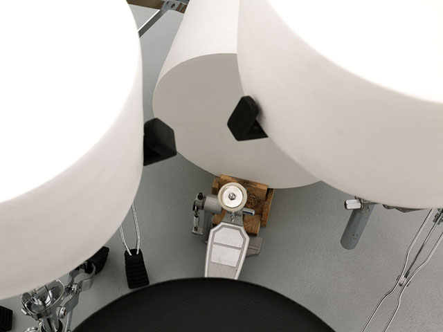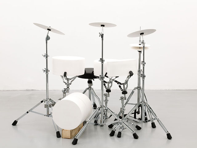 Une batterie comportant un certain nombre de fûts et de cymbales, de formes et de sons différents, fonction de leurs formats et cuissons. Première étape de la recherche : enraciné dans les épisodes précédents de mon travail sonore, notamment la table musicale de Conférence Concertante, la Table de ping-pong en verre, des cymbales en grès réalisées pendant le premier semestre etc. Entre chaque occurrence, les instruments sont améliorés par Marjorie Thébault et les étudiant.e.s impliqués, selon nos observations.