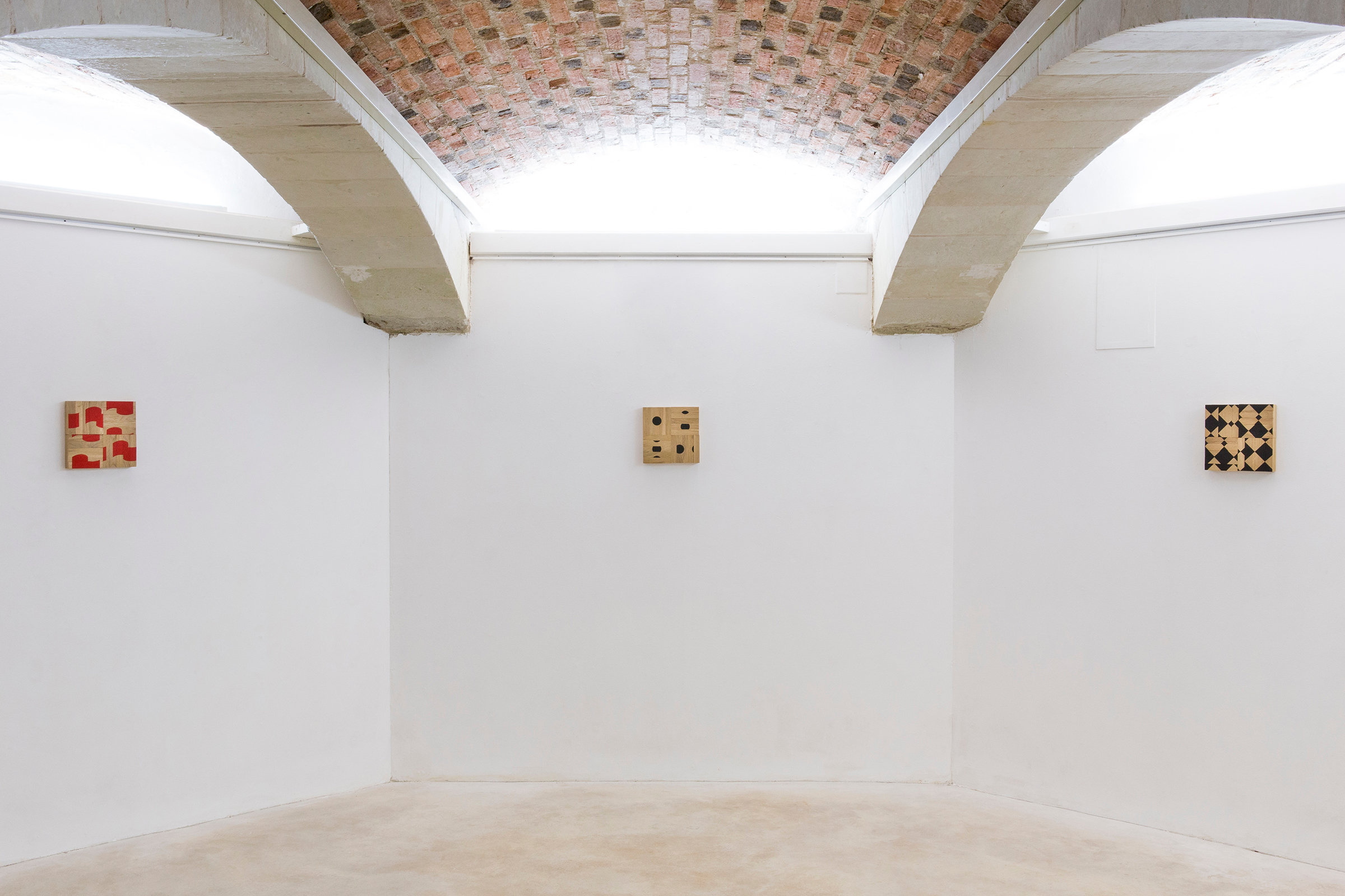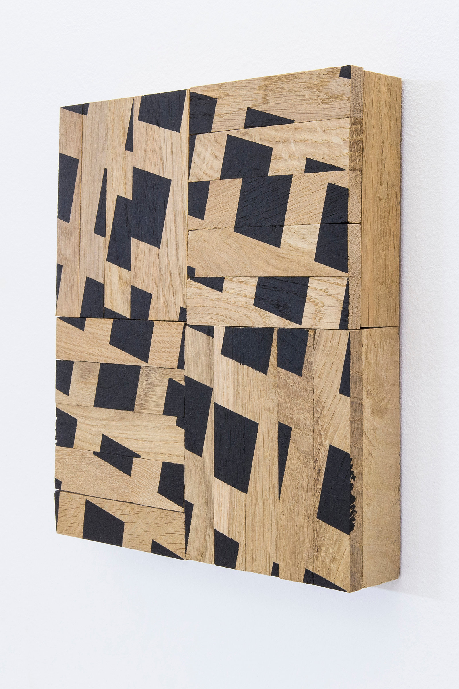 Chemin de croix, 2024Série de quatorze peintures, acrylique sur parquet en chêne, 24 x 24 x 4 cm chacune