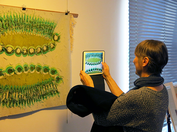 Pour l’appel à projets Les nouvelles verdures d’Aubusson, son approche de la tapisserie se fonde sur des couleurs uniformes et travail sur la symétrie.