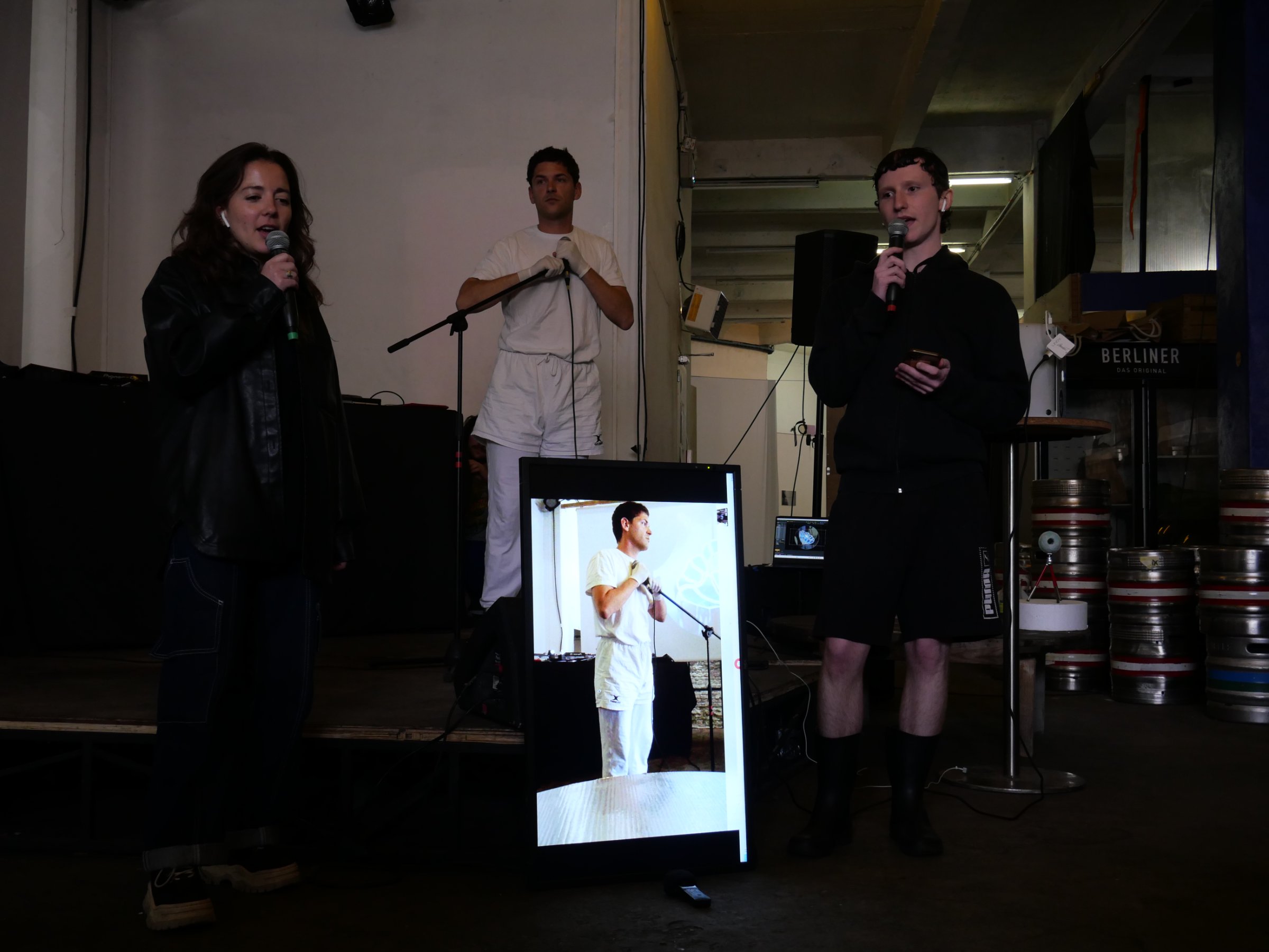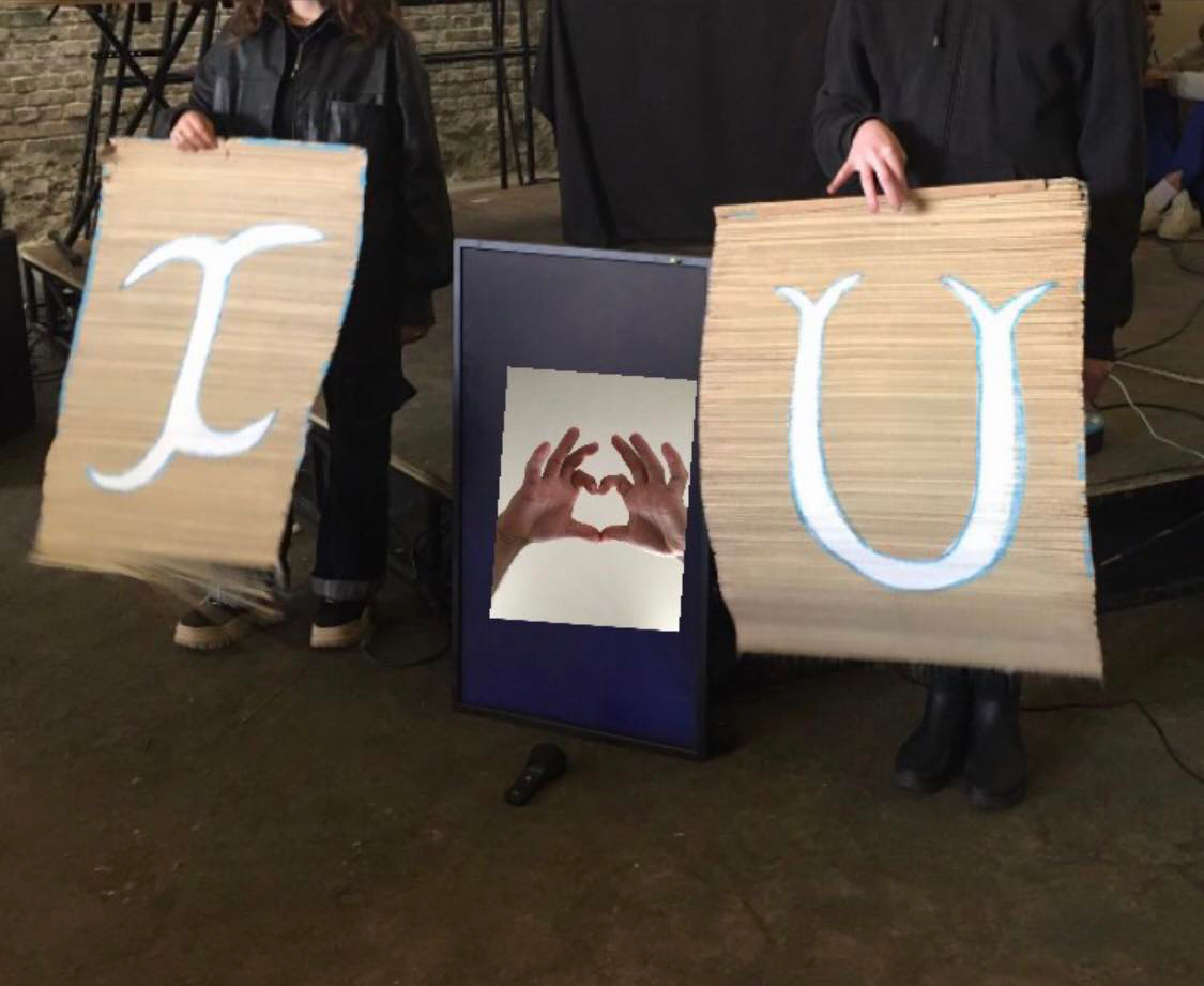 Le texte de cette pièce se veut être une ponction spontanée d’une charge négative de l’atmosphère. Deux « oracles » portant une oreillette, répètent en chœur une longue liste d’affirmations. Derrière et sur un écran entre les deux, je réagis verbalement et physiquement, approuve ou désapprouve, danse ou crie, etc.
