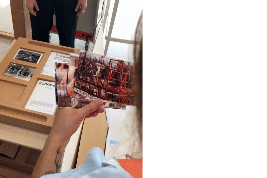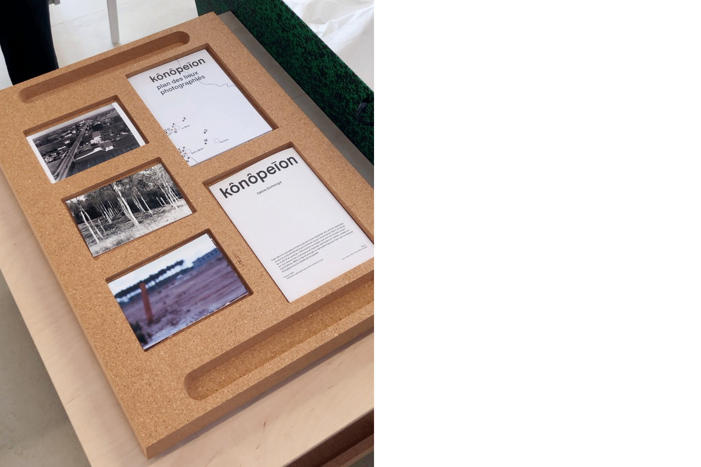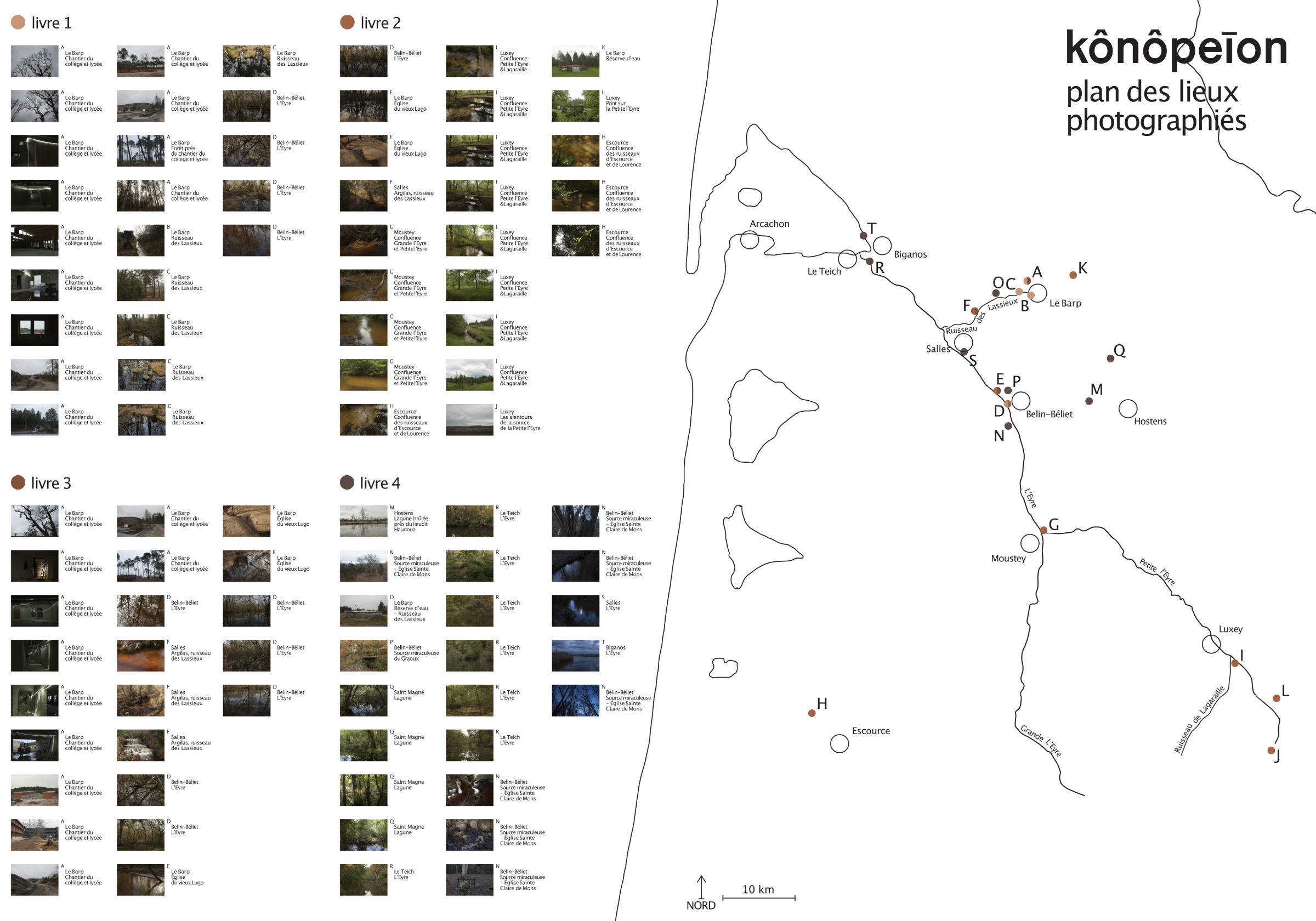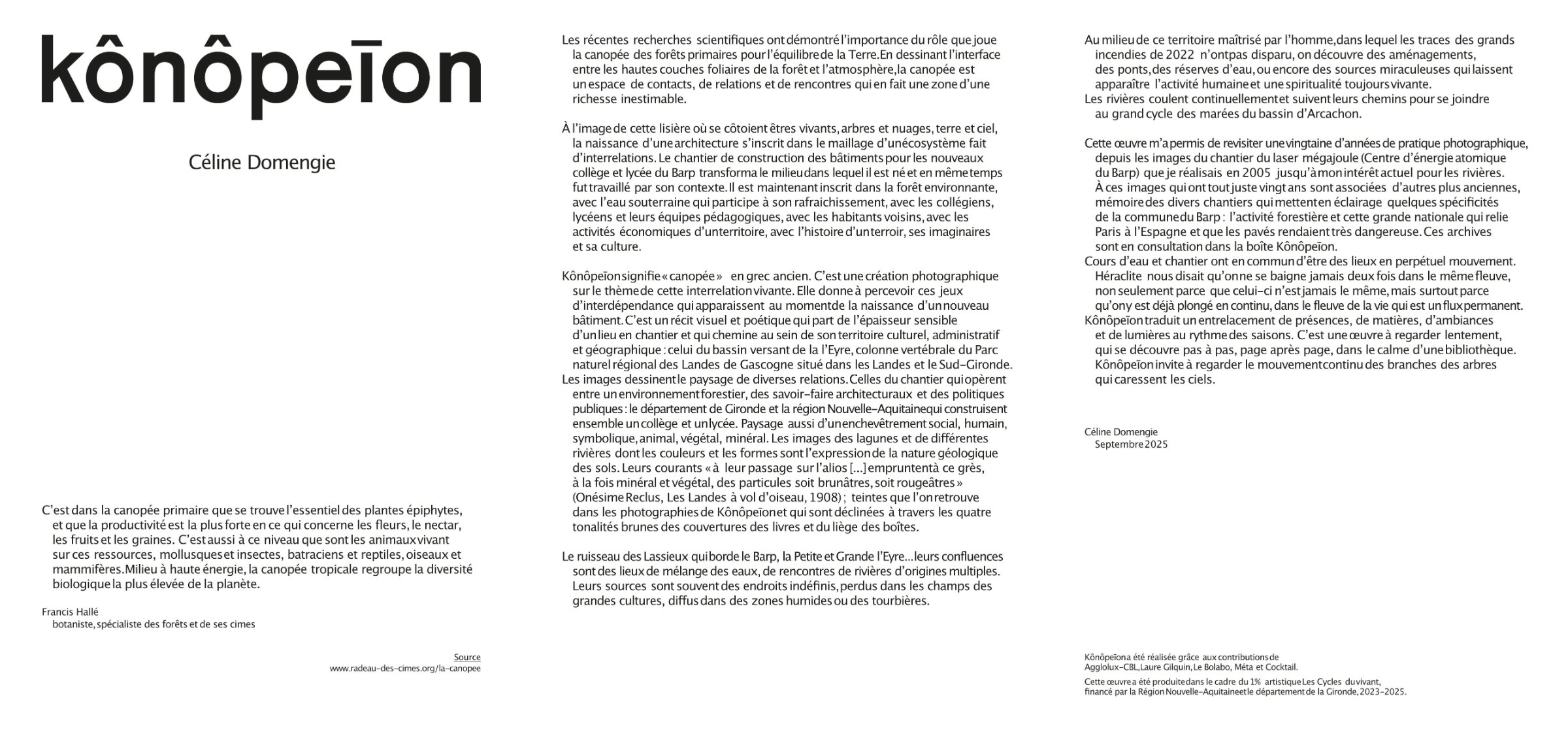 Kônôpeīon signifie « canopée » en grec ancien. C’est une création photographique sur le thème de cette interrelation vivante. Elle donne à percevoir ces jeux d’interdépendance qui apparaissent au moment de la naissance d’un nouveau bâtiment. C’est un récit visuel et poétique qui part de l’épaisseur sensible d’un lieu en chantier et qui chemine au sein de son territoire culturel, administratif et géographique : celui du bassin versant de la l’Eyre, colonne vertébrale du Parc naturel régional des Landes de Gascogne situé dans les Landes et le Sud-Gironde.