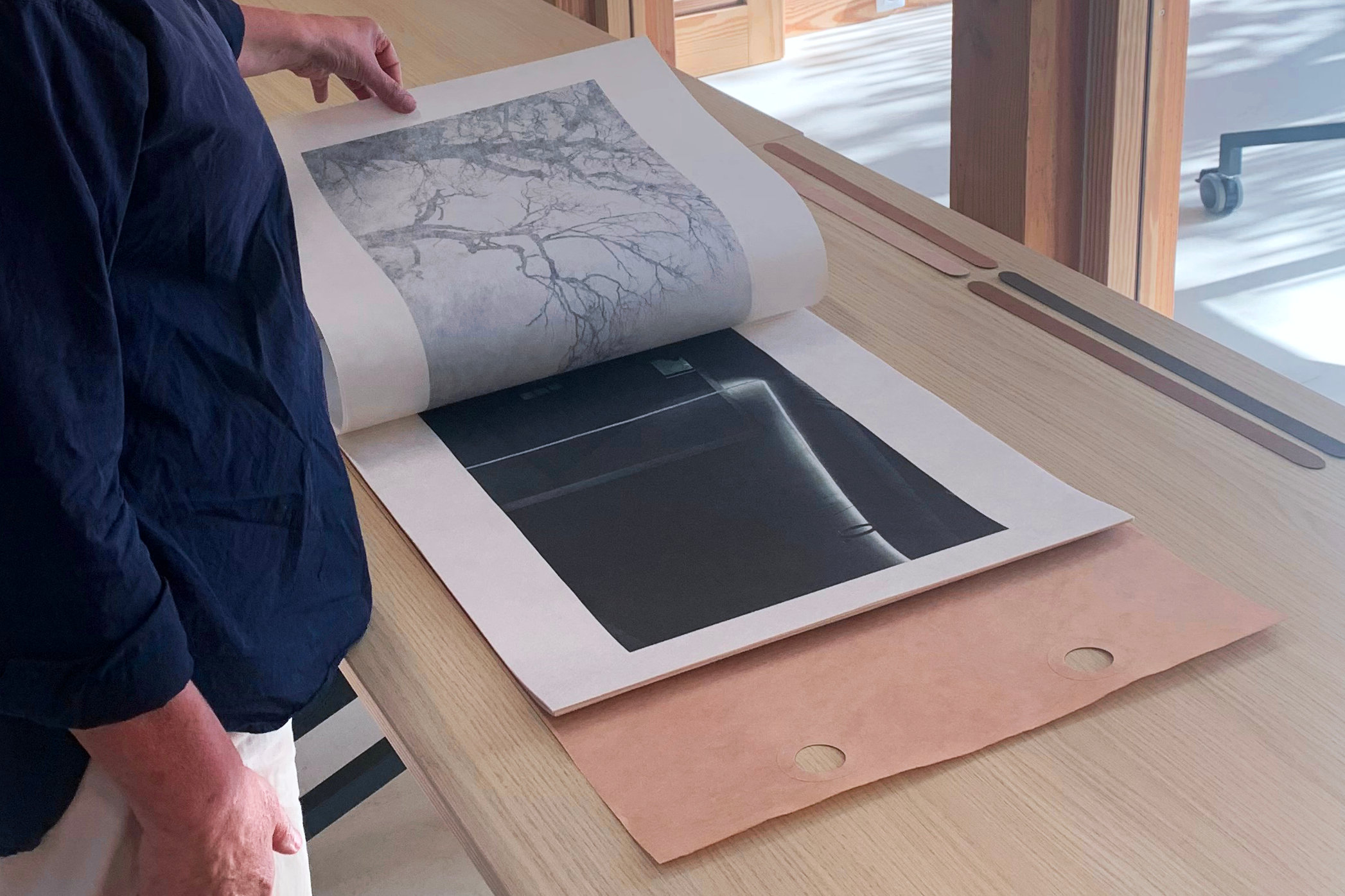 2 boîtes en liège, dimensions ?, contenant : 4 livres photographiques, impression sur papier japonais, dimensions ? chacun (ouverts), 1 livret de présentation, 1 plan des lieux photographiés, 3 séries de photographies imprimées en format 10 x 15 cm Œuvre réalisée grâce aux contributions de Agglolux-CBL, Laure Gilquin, Le Bolabo, Méta et Cocktail Produite dans le cadre du 1% artistique Les Cycles du vivant au collège et lycée du Barp porté par Pointdefuite et Zébra3 Vue d’atelier