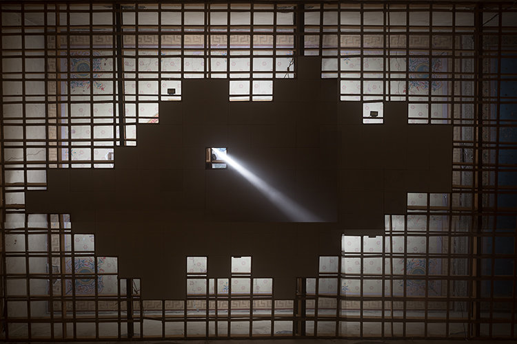 Cette apparence pudique met à nue un environnement imposant, chargé de références. L’esprit des lieux se retrouve ici réanimé. Un halo factice recrée une percée physique proche des phénomènes météorologiques où le soleil perce les nuages. En reliant ainsi le céleste au terrestre, l’artiste fabrique un trompe l’oeil physiologique.