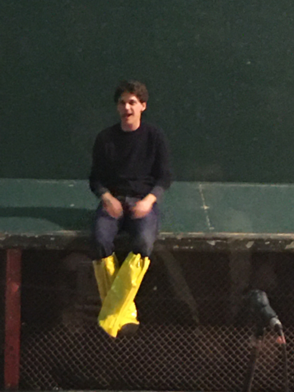 Cette performance s’adresse, à travers une gigantesque paroi de verre, à un public paré de sifflets, cornes de brume et autres accessoires de supporters.