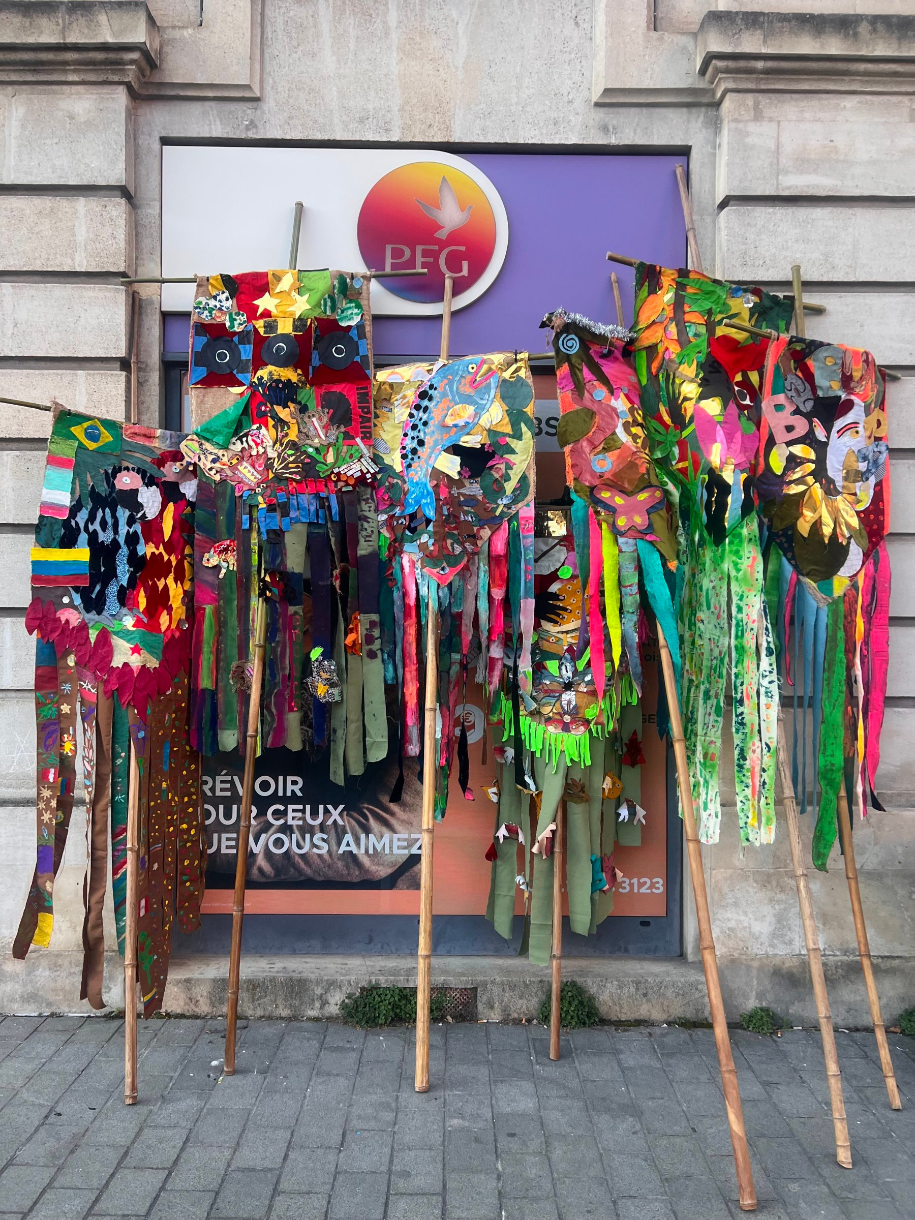 Les étendards, 2023Tissus, toile de jute, peinture et bambou, 250 cm de hauteur