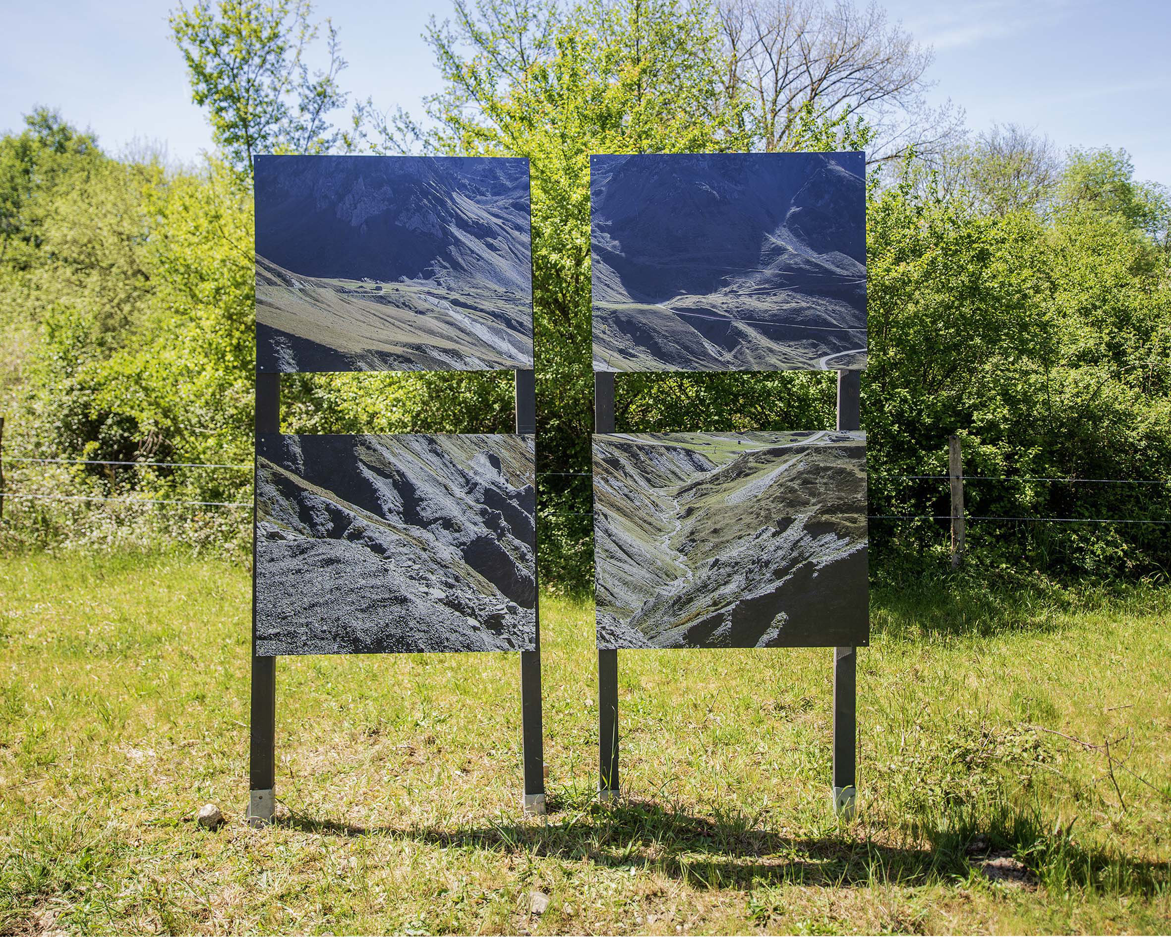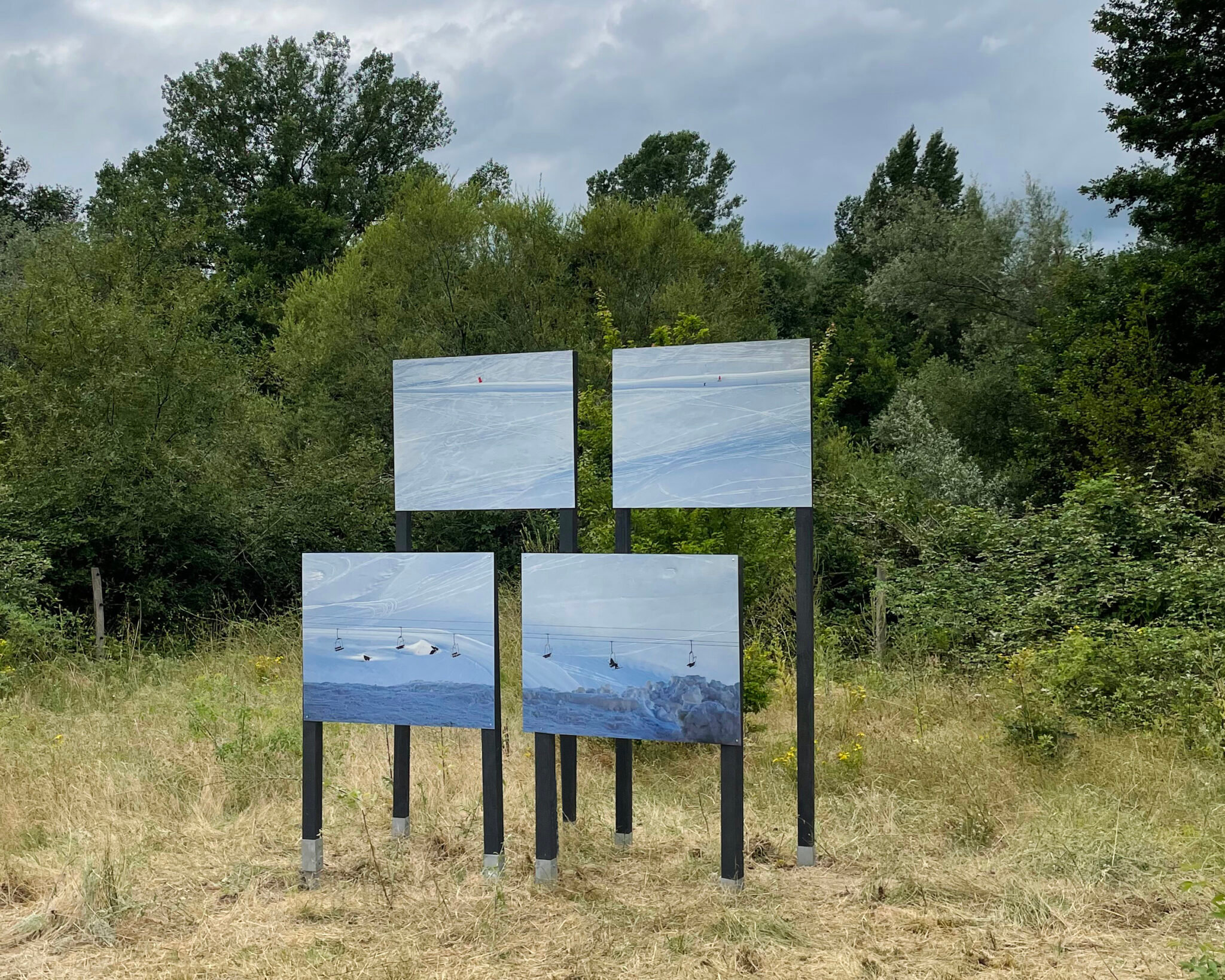 Installation de 3 ensembles, tirages sur dibond, poteaux en bois, 650 x 240 cm, 240 x 240 cm et 240 x 240 cm