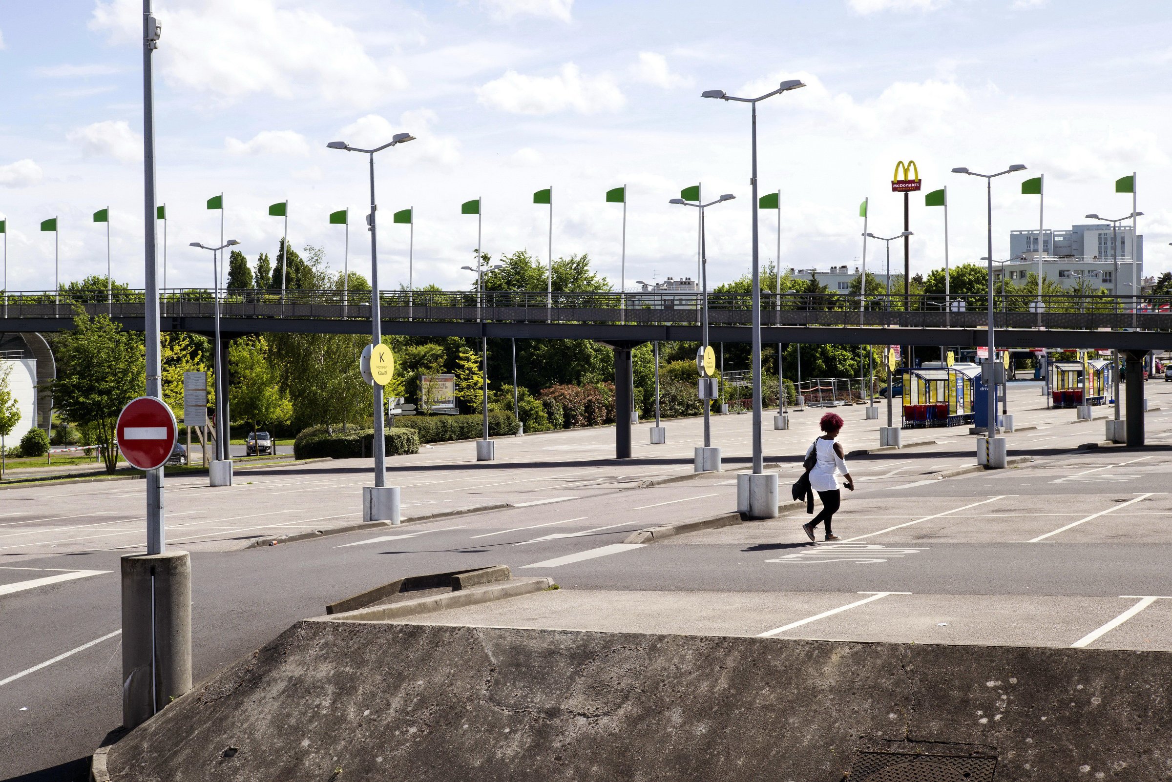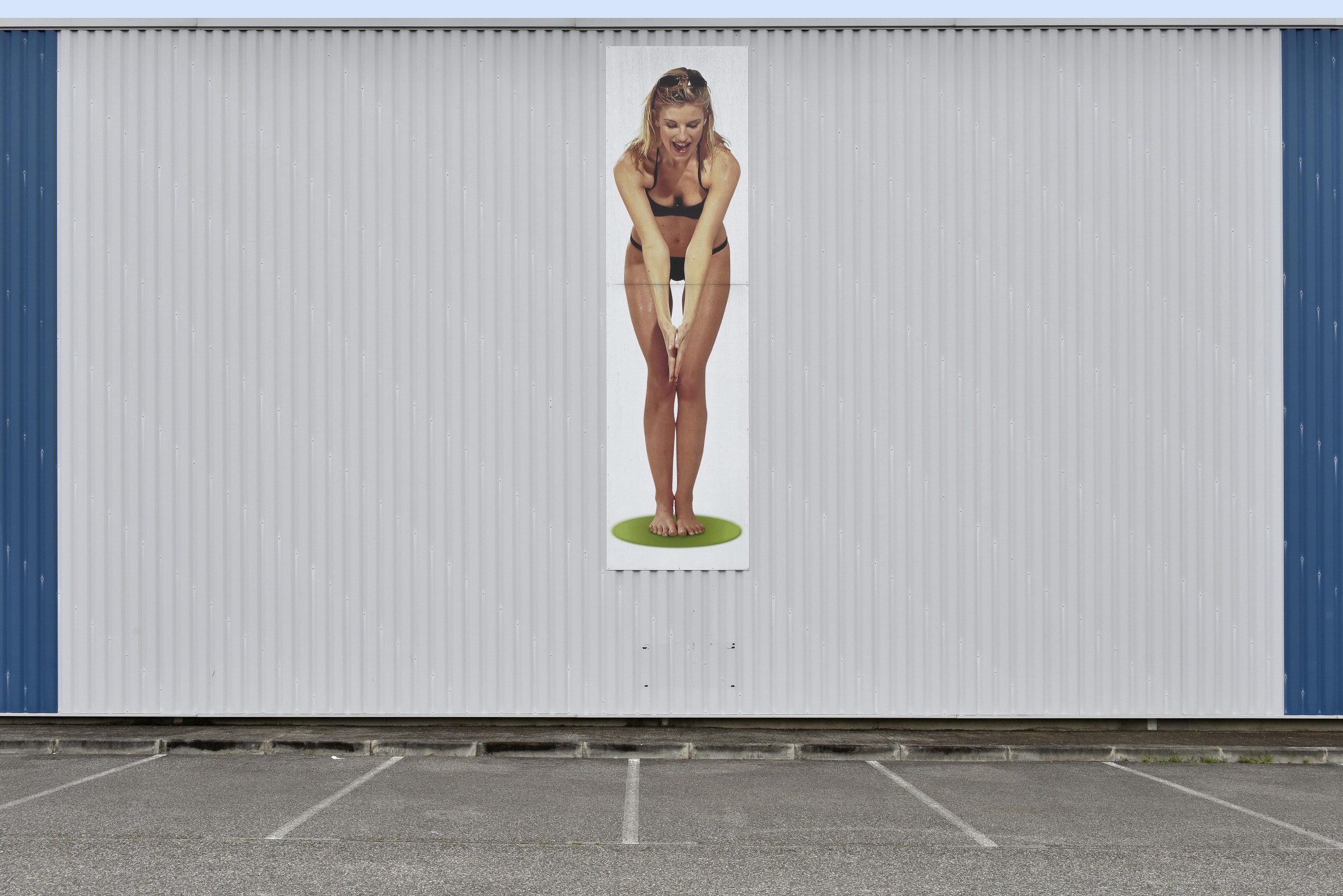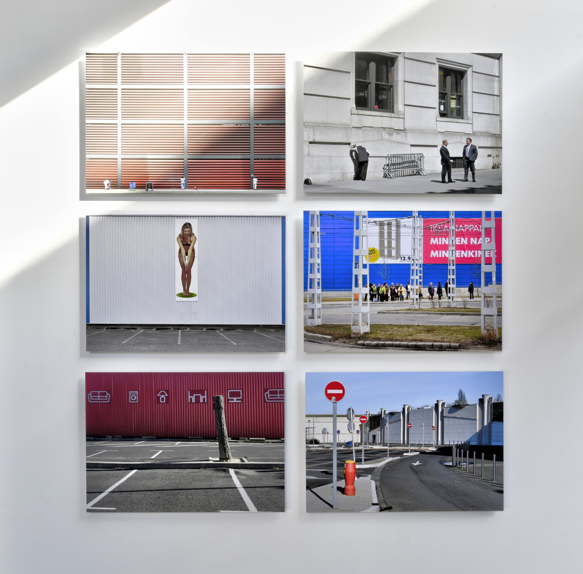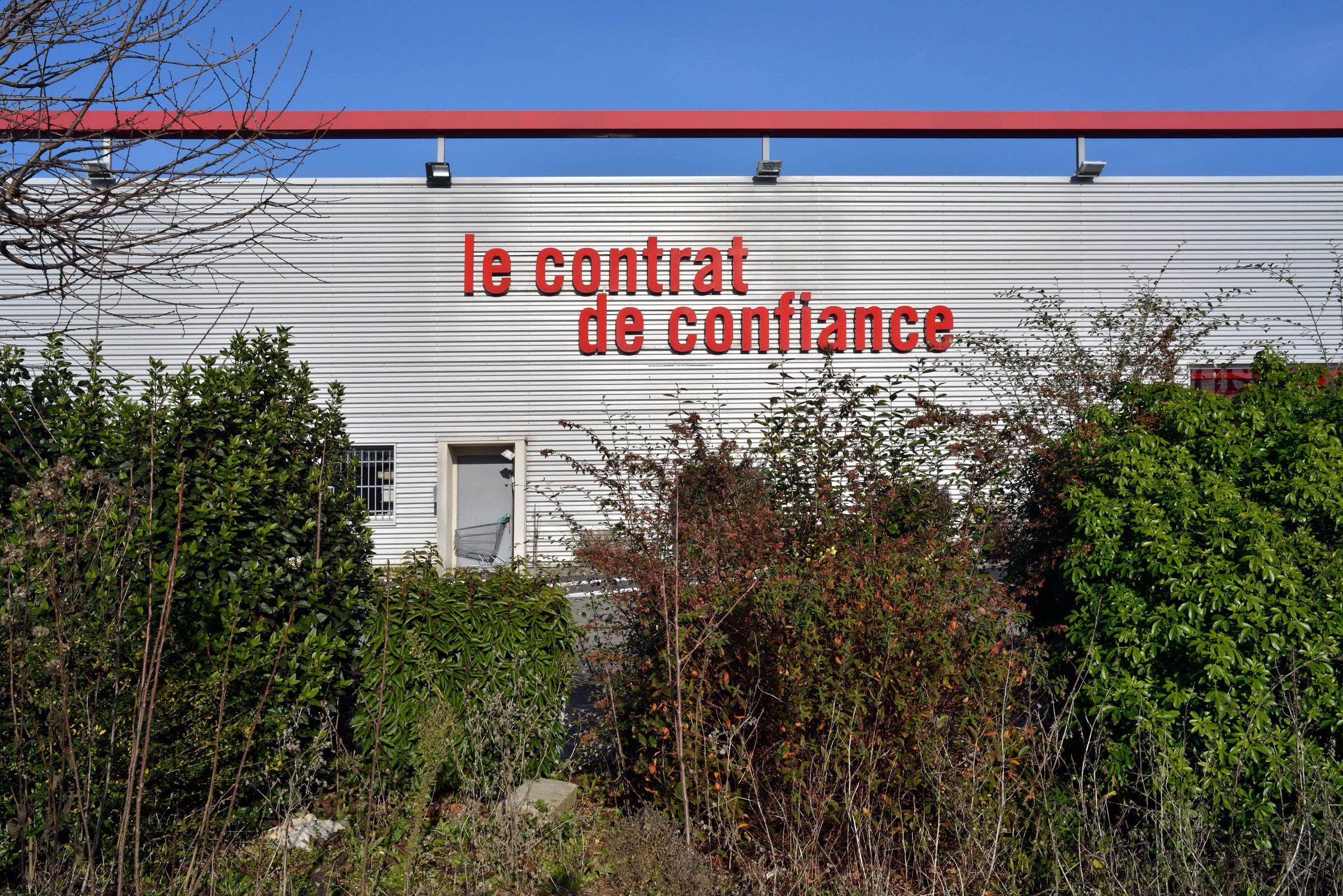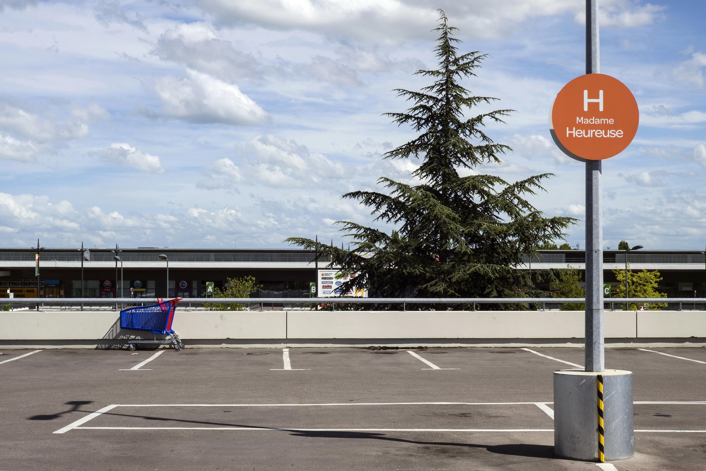 La grande distribution représente en surface plus de 40 millions de mètres carrés en France. Architecture et décors artificiels de la grande distribution offrent aux entrées et sortie des villes des visions parfois surréalistes une fois débarrassées des humains et de leurs voitures.