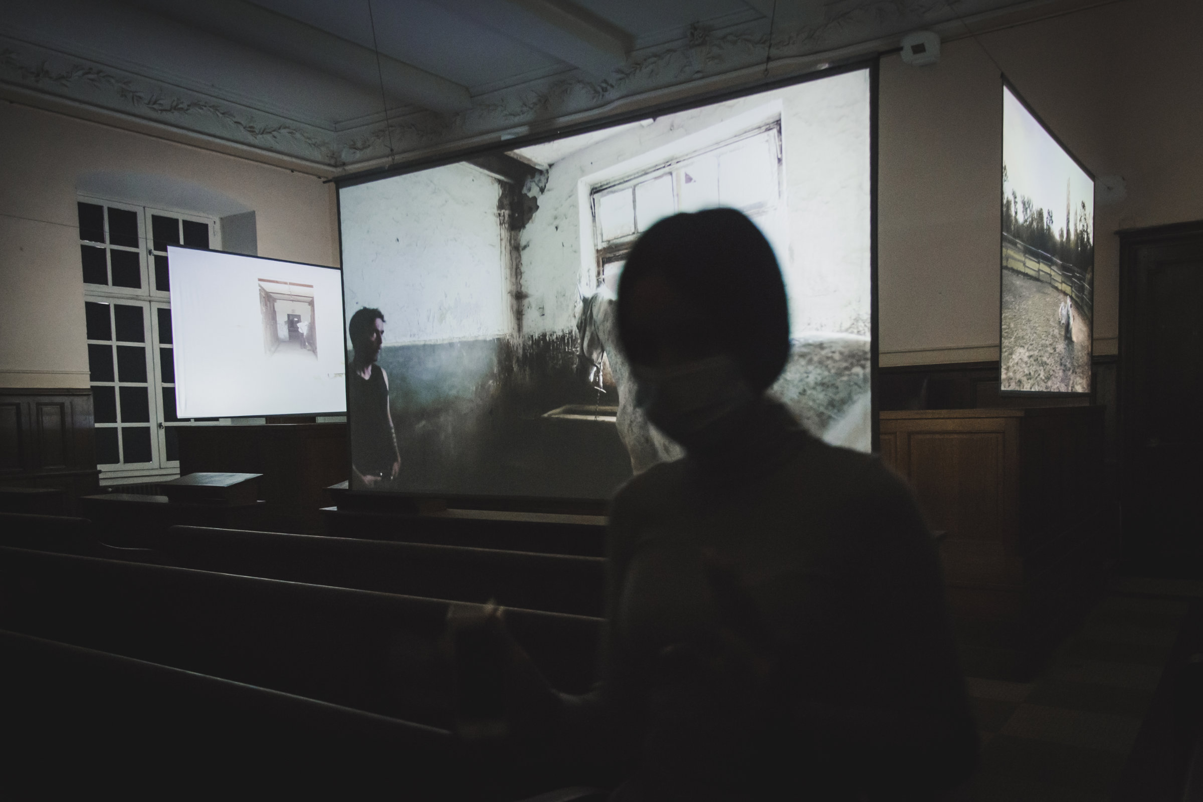 « Tribunal de Grande Instance » : le panonceau sur le fronton du futur haut-lieu des Musées de la Ville de Béziers n’inspire pas confiance. Qu’il soit désaffecté et rebaptisé « Palais Épiscopal » en référence à la fonction première de ce bâtiment historique qui jouxte la cathédrale n’y change rien : un palais de justice, on n’y entre jamais de gaîté de cœur. Mais un chant d’oiseaux nous tire de ces pensées de mauvais augures, à peine franchi le seuil. Une odeur d’humus prend les narines, nous guidant à travers la semi-obscurité des lieux. L’herbe a envahi le sol de la salle des pas-perdus, des troncs gisent devant une grande cheminée en marbre. Comme tombé du ciel, un immense écran barre l’espace, ouvrant sur une forêt verdoyante un jour de pluie. Une langue de brume s’insinue lentement dans l’image et s’enroule autour des arbres. Des silhouettes humaines la traversent, paisibles malgré les flammes qui lèchent leurs vêtements. Ces âmes errantes fuient-elles quelque catastrophe urbaine ou font-elles partie du bestiaire de créatures merveilleuses peuplant les forêts ? Sont-elles des messagers de l’Apocalypse ou des martyrs, après un geste ultime de protestation ? Le cheval qui les observe sans broncher, tapis dans les fougères, se contente de renforcer l’inquiétante tranquillité de la scène sans donner de réponse. Julie Chaffort connaît bien ce sentiment, pour avoir tourné dans les forêts nombre de ses vidéos, la figure animale y étant quasi omniprésente. Pour l’artiste, le cheval est le « témoin privilégié de quelque chose que l’on arrive plus à percevoir en tant qu’humain ». Un témoin qui s’avère le protagoniste de son exposition, un leitmotiv dans une partition tragi-comique nous menant d’un univers « intemporel » et obscur propre aux contes à celui, désenchanté, d’un manège de jouets en plastique exposés en pleine lumière. Dans un mouvement à contre-courant, plus on avance vers la clarté, plus on glisse dans une folie latente.