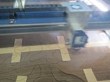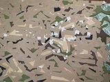 Les matériaux (médium, feuilles de bois teintée), la technique (placage) et le graphisme (motif du camouflage militaire), viennent renforcer l’idée de copie, de nature manufacturée, d’ersatz d’arbre.