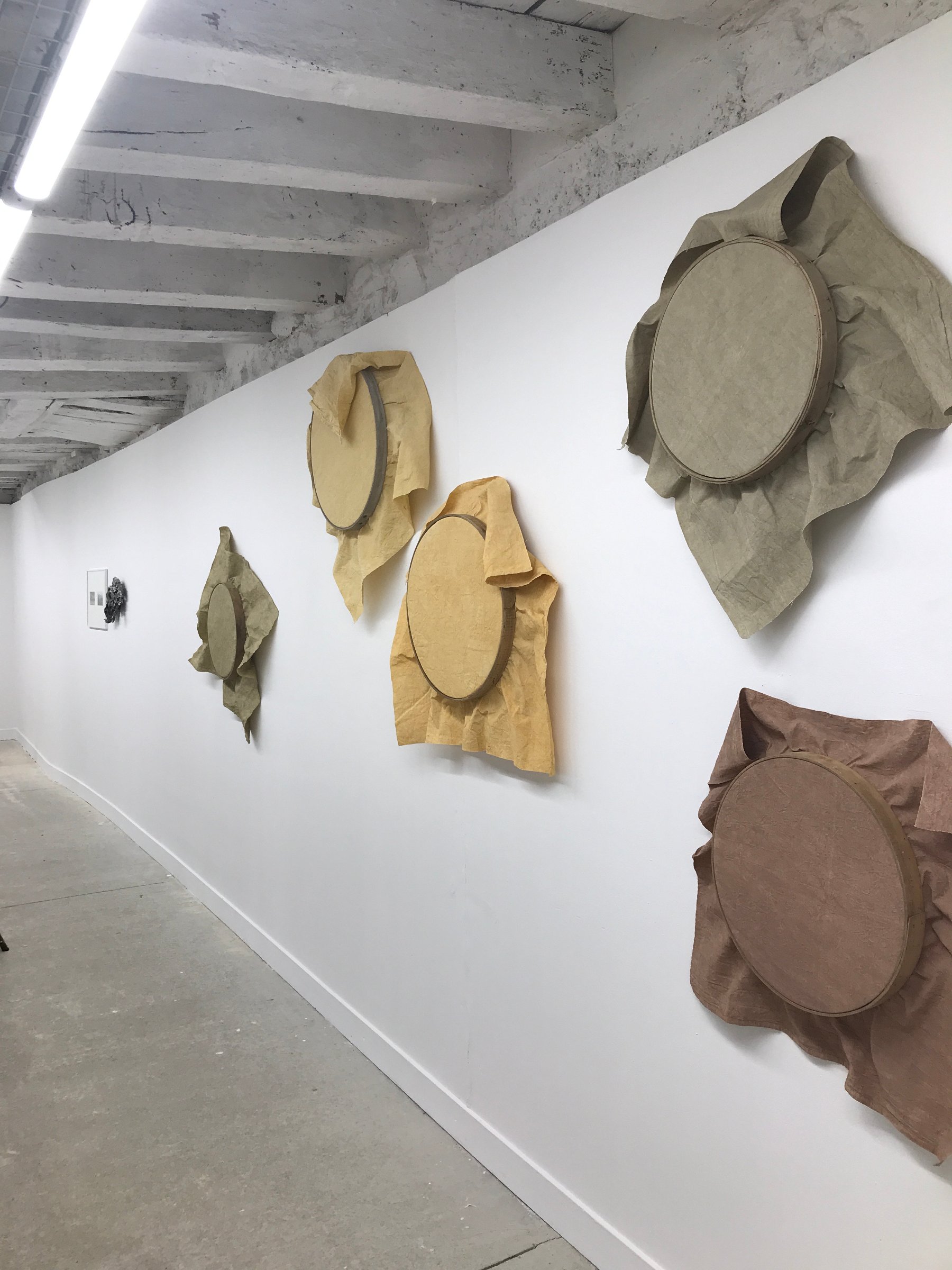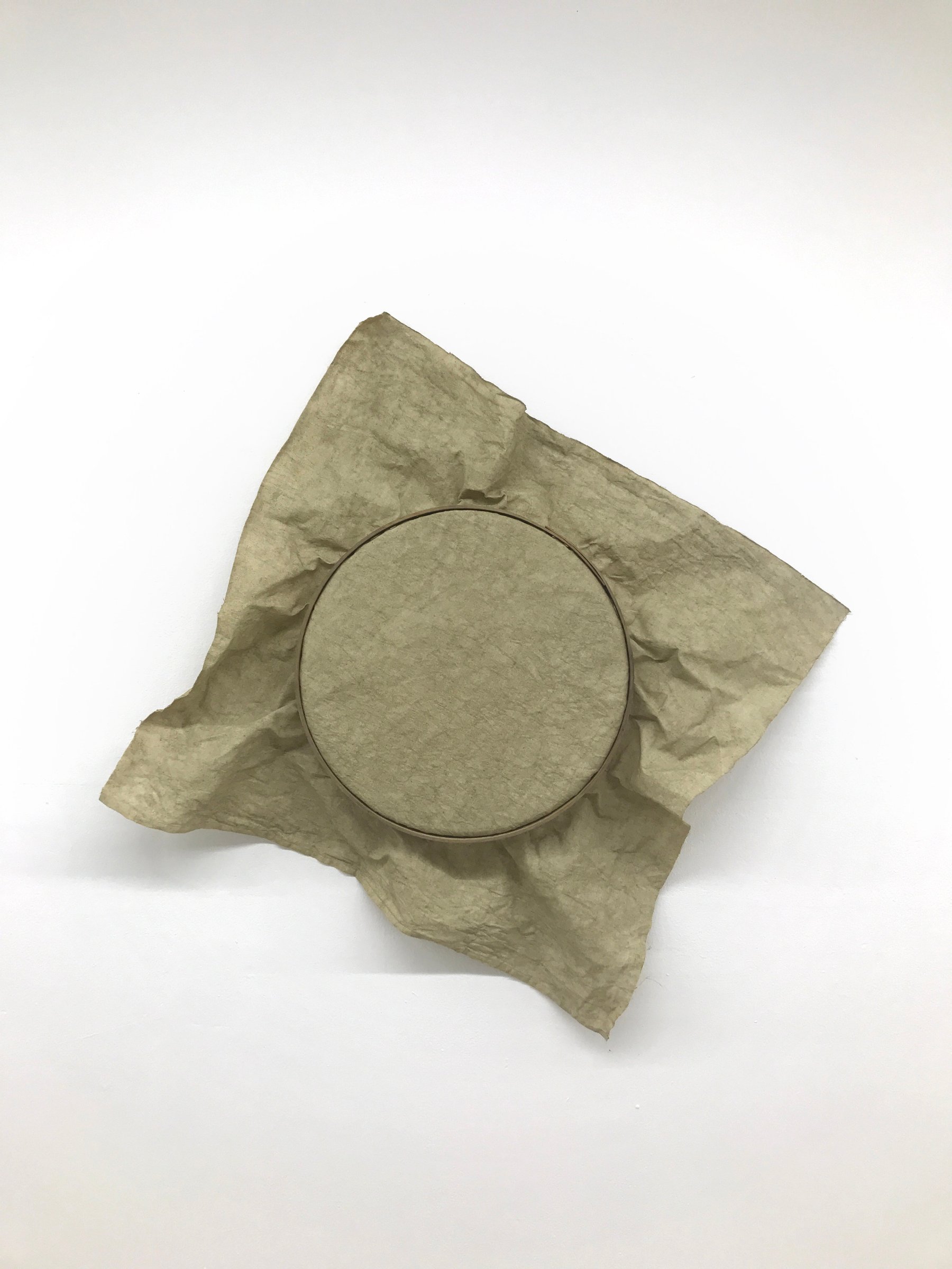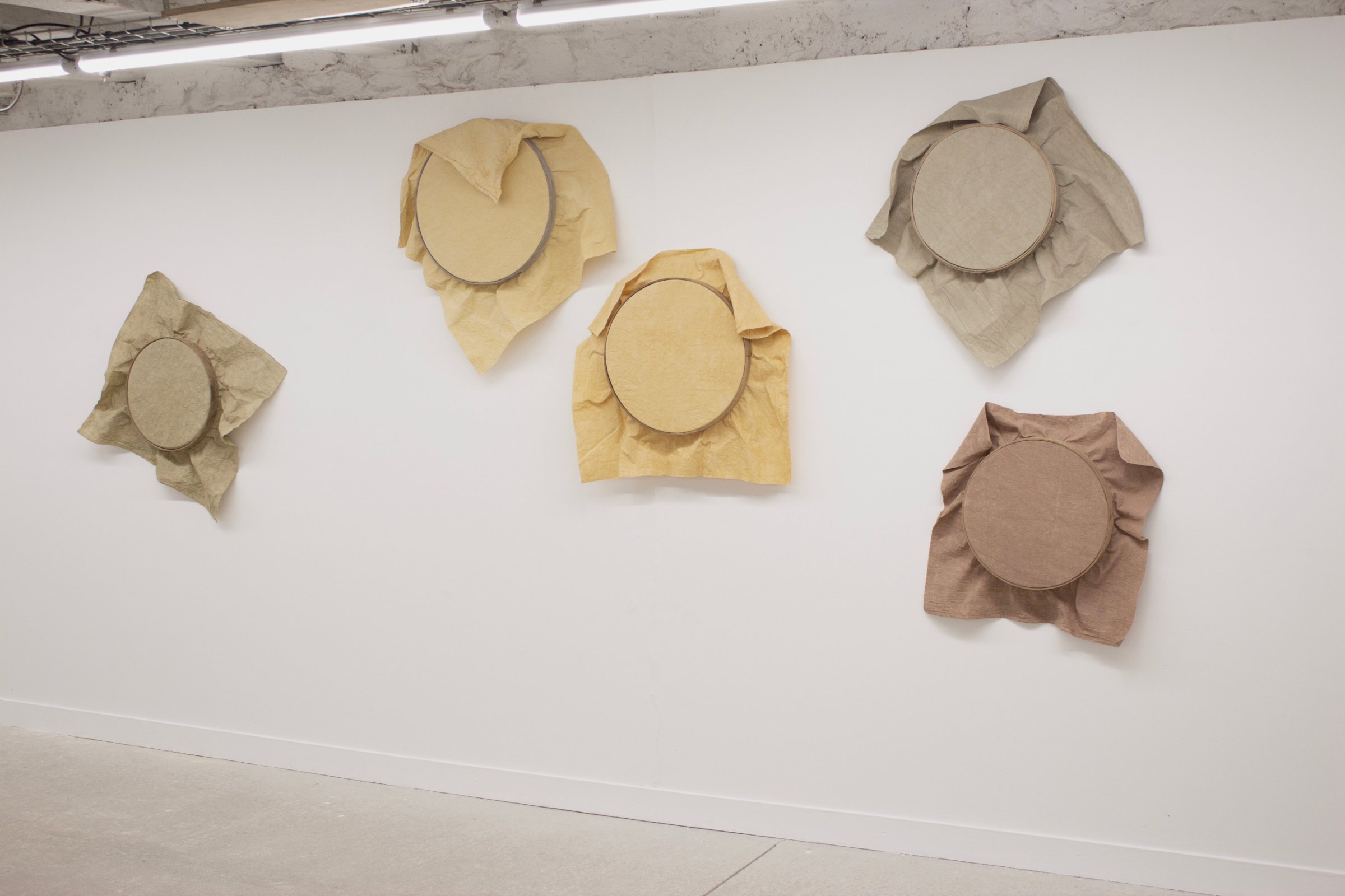 2025Série de 5 formatsToile métis teintée à l’argile de récolte tendue sur tamis, ⌀ 45cmVue de l’exposition Fragments de la matière du monde, Lac&s Lavitrine, Limoges, 2025