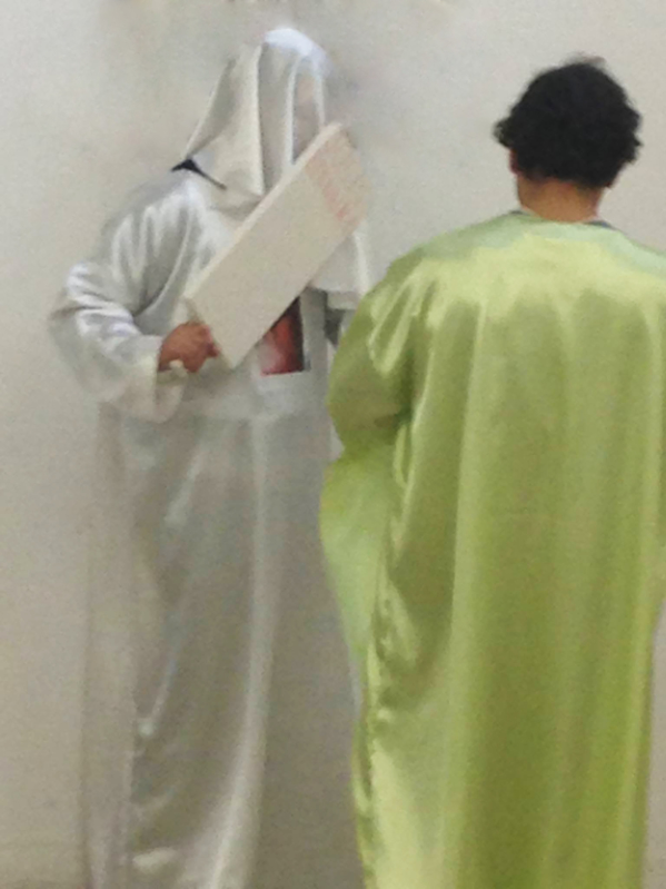 Avec mon ami Boris Kurdi, nous lisons une fois chacun deux textes sur la différence entre amour propre et amour de soi. Nos portraits plus ou moins flatteurs sont floqués sur nos costumes et nous portons des panneaux en polystyrène sur lesquels nos noms sont inscrits.
