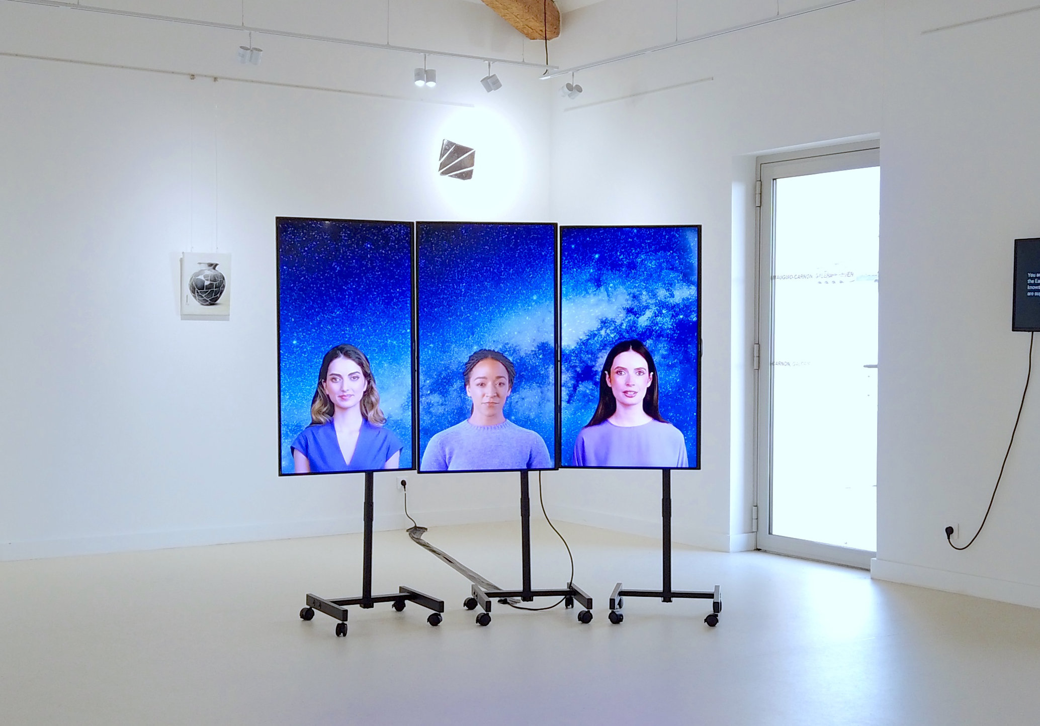 L’installation vidéo Seules les plus brillantes prend racine dans l’étude du projet « Cartes du ciel », qui s’est étendu de 1887 à 1970 : une vaste démarche scientifique partagée par seize observatoires dans le monde et visant à cartographier le ciel. À partir de plaques photographiques, des centaines de femmes ont travaillé à calculer le positionnement de millions d’étoiles dans un total anonymat. Intriguée par le constat de l’invisibilisation de ces scientifiques, Marianne Vieulès imagine une réalité alternative dans laquelle elles auraient décidé de partir dans l’espace en vue de poursuivre leur mission première en s’éloignant à l’infini de la Terre, de leur culture et de leur mémoire jusqu’à la rupture. Lela visiteurse voit ici le premier épisode d’une série. Trois personnages y décrivent en chorale un objet tout à fait banal pour nous car venu de notre époque, mais qui leur est inconnu. Dans les prochains épisodes, elles échangeront sur de nouveaux objets et apporteront plus d’indices quant à la période de leur mission et leur localisation. Les dialogues sont générés par une intelligence artificielle, les images aussi, d’où une inquiétante étrangeté. Lela spectateurrice peut tenter de deviner la nature du mystérieux objet au centre de l’échange des scientifiques, imaginer...