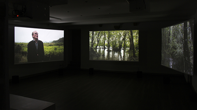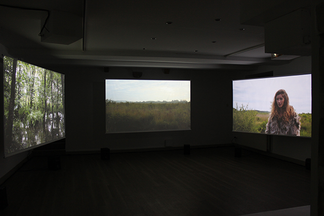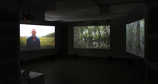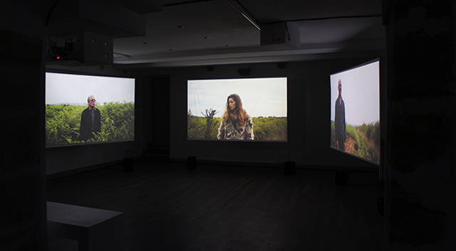 Bien que l’imposante installation de Julie Chaffort, qui donne son titre à son exposition personnelle à la fondation Bullukian, s’intitule Somnambules, les personnages qui la hantent paraissent plutôt être atteints de somniloquie. Yeux ouverts, les êtres isolés qui apparaissent alternativement sur les trois écrans de projection ne se promènent que peu. Mais les bouches d’abord closes s’ouvrent pour laisser place à des chants que chacun des six protagonistes vient déclamer a capella, dans un environnement pour le moins surprenant. Derrière Grannhild, entonnant un cristallin « Voyage voyage », la soprano Jeanne Crousaud interprétant le poignant « When I’m laid » du Didon et Énée de Purcell, ou encore Wladimir Rehbinder, chef de chœur d’une église orthodoxe, psalmodiant un stichère, se meuvent dans le vent des ciels clairs ou sombres sur lesquels se dessinent des paysages verdoyants. Comme dans d’autres vidéos de Julie Chaffort,