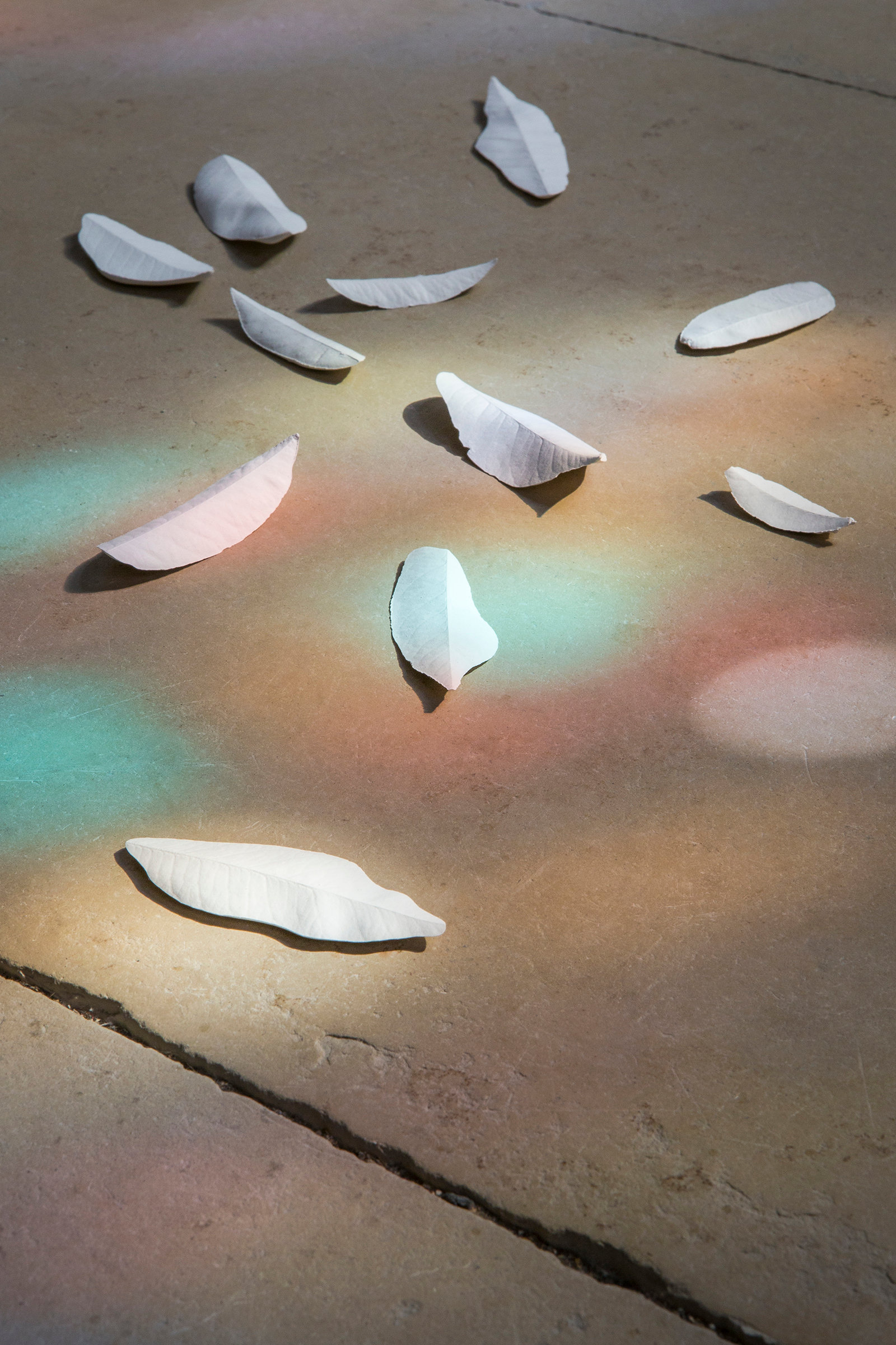 Installation d’environ 2200 empreintes de feuilles. Plâtre, eau de pluie, 20 m x 14 m x 3 cm