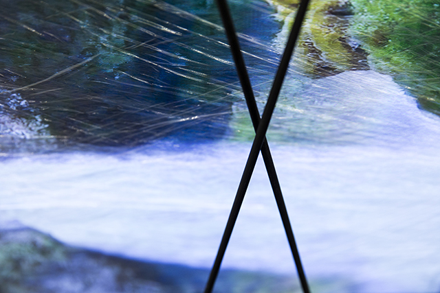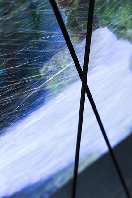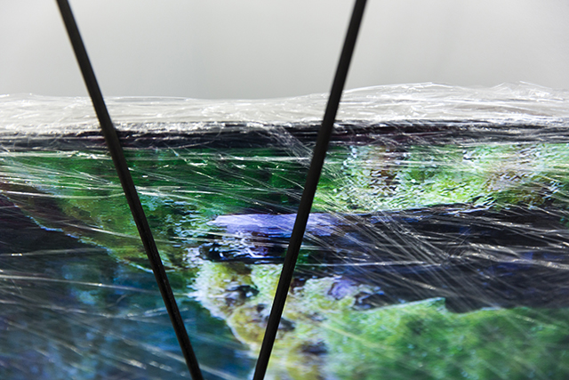 Écran plat, film d’emballage, boucle vidéo 32’14, fibre de carbone, miroir, 50 x 54 x 144 cm