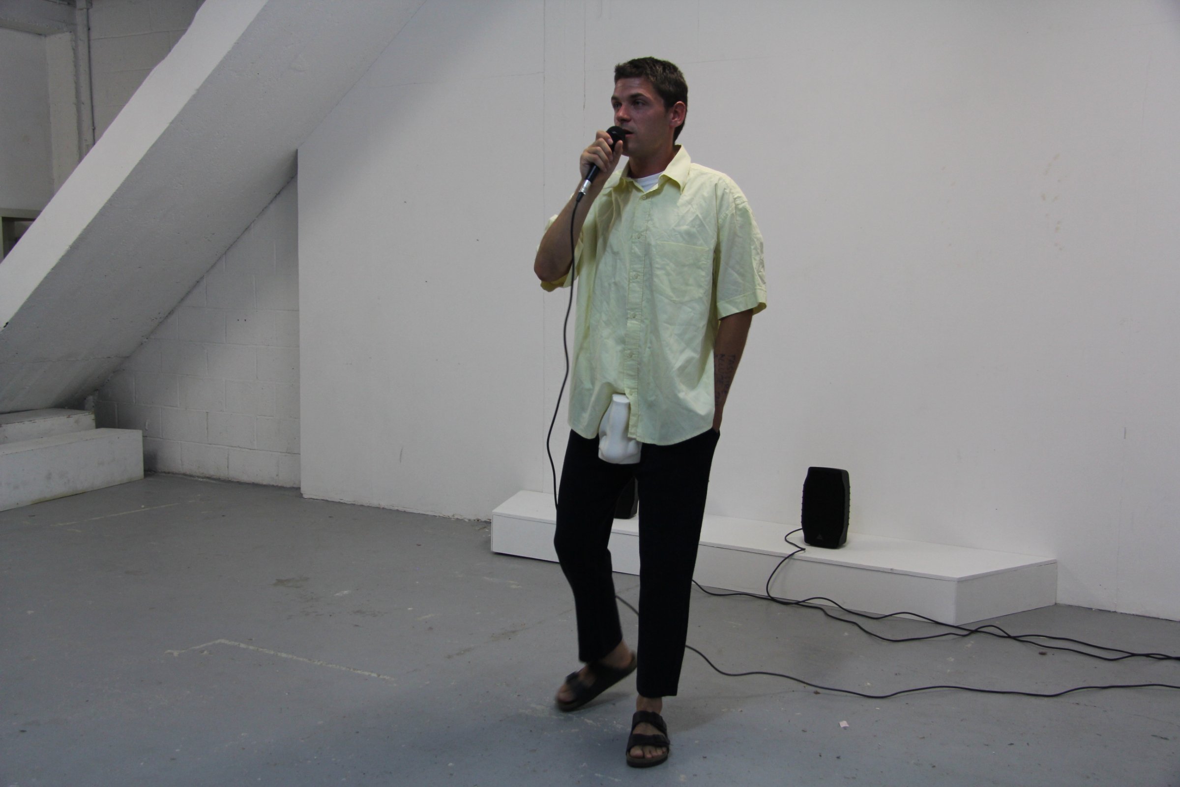 A l’intérieur de la galerie, portant une reproduction en plâtre du nez de David de Michel-Ange, je chante une chanson de Daniel Johnston et demande au public, comme il l’a fait en 1990, de reprendre avec moi l’unique phrase de Funeral Home : « Maison funéraire, maison funéraire, je vais à la Maison funéraire, j’ai acheté un cercueil brillant et noir, je vais aux funérailles et je ne reviendrai jamais. »
