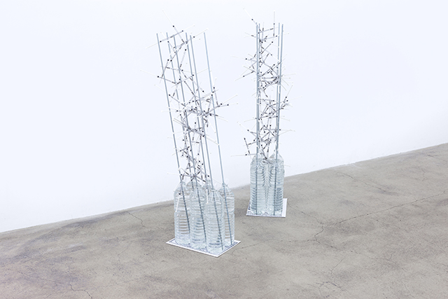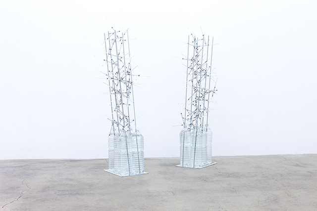 Bouteilles en plastique, eau, impression laser A4 noir et blanc sur papier 160g, acier inoxydable, seringues insuline 1cc., 110 x 21 x 29,7 cm
